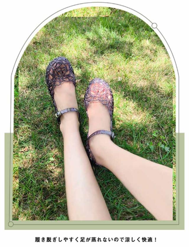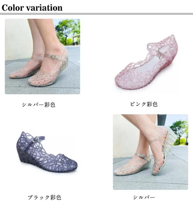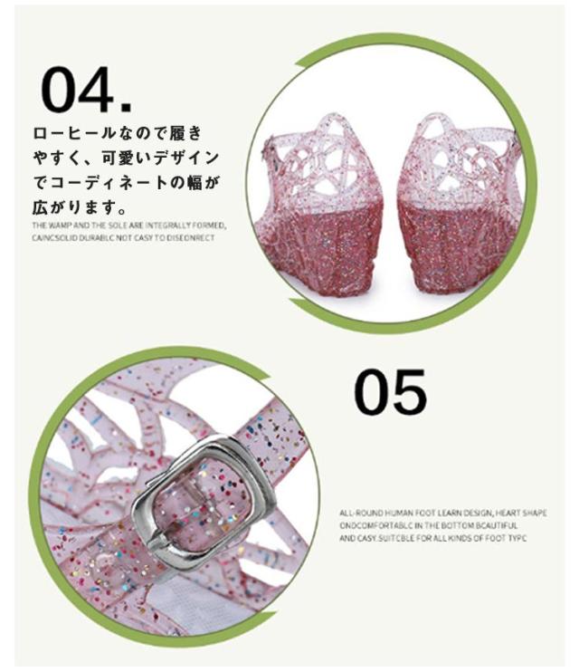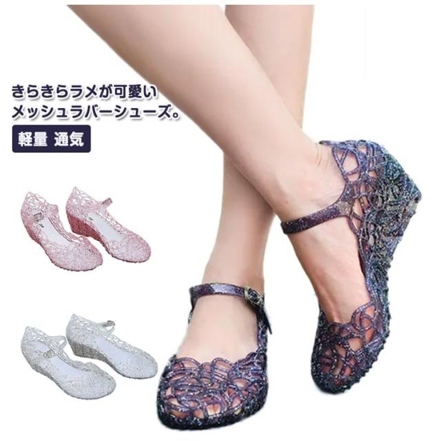 | きらきらラメが可愛いメッシュラバーシューズ。 PVC素材なので柔軟性があり、しなやかなので足が疲れにくい! ローヒールなので履きやすく、可愛いデザインでコーディネートの幅が広がります。 メッシュな感じが涼しげで、街中はもちろん、海やアウトドア、旅行先にもオススメ。 履き脱ぎしやすく足が蒸れないので涼しく快適! 夏に重宝する事間違いなし! | |