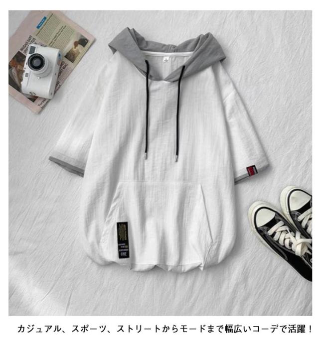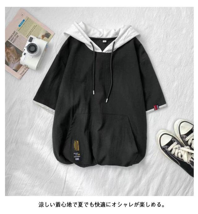 半袖 薄手 メンズ 夏用 半袖 接触冷感 フード付きパーカー パーカー 速乾 フード付き 配色 吸汗速乾 冷感 プルオーバー 五分袖 カジュアル 涼しい トップス 切り替え 通学 ブラック ホワイト グレー ブルー