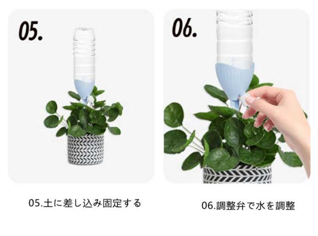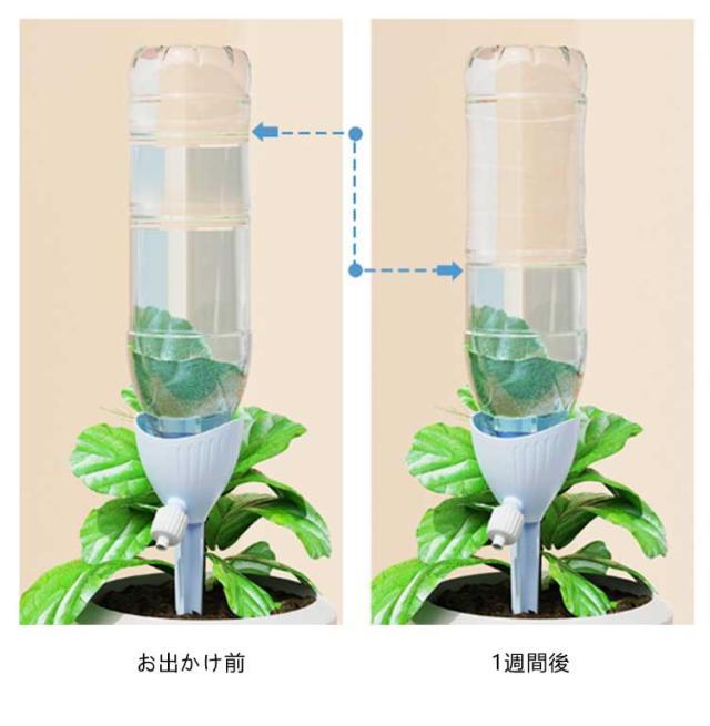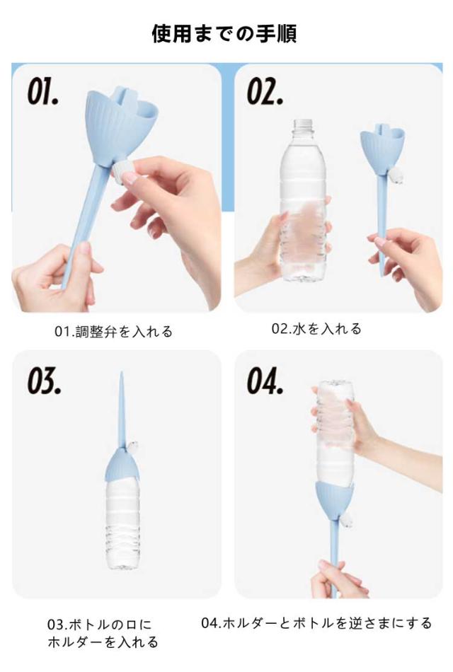 | 工事不要・無段階速度調節・均一な放水 ペットボトルの形にかかわらず 自動水やり器 【4個セット】 ペットボトルで自動給水器に! 忙しい毎日の生活や旅行での水やりに最適な商品です。 ネジの調整で水滴の速度を調整できます。 もう困らない!外出中の水やり簡単! 留守中だけでなく、水が乾きやすい時期の水やり用としても夏場など外でこまめに水を上げるのが大変な時にも役立ちます。 <お勧めポイント> ●無段階速度調節 水やりの量は植物種類と土によって異なるため、違う植物に適度の量をバルブ(給水弁)で調節するこどが可能。 ※旅行など不在中の利用では、事前に必要な水の量など確認してからご使用ください。 その日の気候や植物によって必要な水量は異なってきます。 ●水の出る速さ。均一な水配分。 滴下速度は水圧の影響を受けません。 ●空きペットボトルに付けて使える 直径28~30mmに対応。 ペットボトルの形にかかわらず。 市販のほとんどの飲料ボトルに適しています。 ●剣型ポールで差し込みやすい 安定していて壊れにくい。 十字の尖ったトップは土に素早く差し込みやすく、倒れにくいです。 ●組み立て不要 ペットボトルに取りつけるの自動給水栓 ●ペットボトルに付けるだけ 鉢植え・プランター・花壇など、土に挿せるところであればどこでも設置可能水を入れた容器を装着させ、鉢植えに挿すだけで自然に水が落ちていきます。 <details> ●テーパーインサート土壌に素早く挿入できます。 ●つや消しの表面水に濡れても滑りません。 ●調整弁の設計水の出力を制御します。 ●PP素材。快適な感触 | |