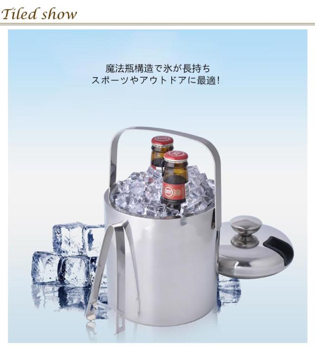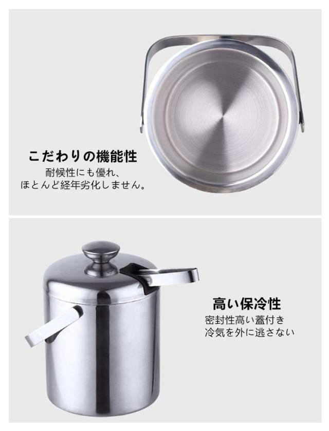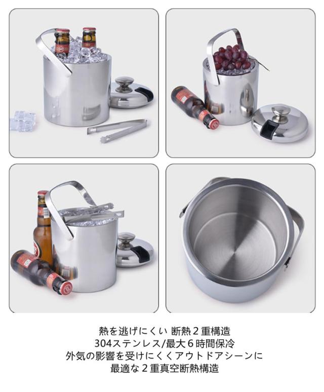 | 2重真空断熱・304ステンレス 蓋・トング・スノコ付き アイスペール4点セット 1300ml 魔法瓶構造で氷が長持ち スポーツやアウトドアに最適! 家飲みやホームパーティーにピッタリの容量1.3Lの氷入れ。 熱を逃げにくい 断熱2重構造 304ステンレス/最大6時間保冷 外気の影響を受けにくくアウトドアシーンに最適な2重真空断熱構造 氷以外のも使い方いろいろ 冷たい飲み物やフルーツの保冷にも ステンレス製のトング付き。 氷を溶けにくくするための専用スノコが付いています。 ハンドル付きで持ち運びもらくらく。 専用の蓋付きで、氷が溶けにくく清潔にお使い頂けます。 冷蔵庫へ何度も氷を取りに行く手間が省けて、省エネにもなります。 <お勧めポイント> ●コンパクト 持ち手が付いていて、持ち運び楽々 ●高い保冷性 密封性高い蓋付き 冷気を外に逃さない ●こだわりの機能性 耐候性にも優れ、ほとんど経年劣化しません。 | |