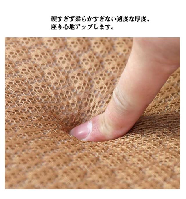 | 通気性のあるゲルカーシートクッションユニバーサルシート。 座り心地を改善したい方におすすめの「ゲルクッション」。 硬すぎず柔らかすぎない適度な厚度、座り心地アップします。 クッション性に富んだゲル素材を使用。ジェルクッション特有のクッション性で座るとき体の重さと座面からの圧迫を吸収。 【最新代立体カット構造ゲルクッション】人間工学に基づいて設計されたゲルクッションは立体的な六角形の格子が規則正しく並んでおりますので、より細かく体圧を分散でき、より軽やかな座り心地を楽しめます。二つ折り立体カット構造でお尻とクッションの間のエアサイクルをうまくなって、夏場での使用にも蒸れずに快適な使い心地です。 【カバー付き】 カバーは吸湿、通気性に優れた生地を採用し、シワになりにくい,様々な椅子にマッチします。裏面に滑り止めが付いており、滑りやすい素材の椅子でもズレにくく快適に使用できます。 【いろんな使用シーンに活躍】持ち運びしやすい折りたたみ式なので、ピクニックやスポーツ観戦、アウトドアなど外出先でレジャーシートの上で快適に座りたい場合におすすめです。その場合だけでなく、長時間座るデスクワークや車の運転、床ずれができやすい車椅子の利用者にも様々なシーンでお使いいただけます。 【いつも清潔に】クッションはあまり洗わないことを考慮し、汚れても落ちやすい防汚生地を採用します。★軽い汚れの場合は濡らした布などで拭き取って、簡単にお手入れ ★汚れがひどい場合は中性洗剤を薄めた水で優しく手洗い、よくすすいで風通しのいい場所で乾かしてください。 | |