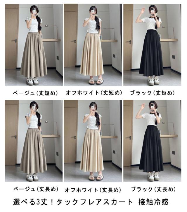 | 選べる3丈!タックフレアスカート 接触冷感 たっぷりの分量感が涼し気なタックフレアースカート。 ウエストまわりのタックでメリハリがつき、腰回りをすっきりと見せてくれます。 接触冷感でひんやりとした着心地。 ウエストは総ゴム仕様で、ストレスフリーな着心地。 動くたびに美しく揺れるマキシフレアスカートはどんなコーデでも相性抜群! | |