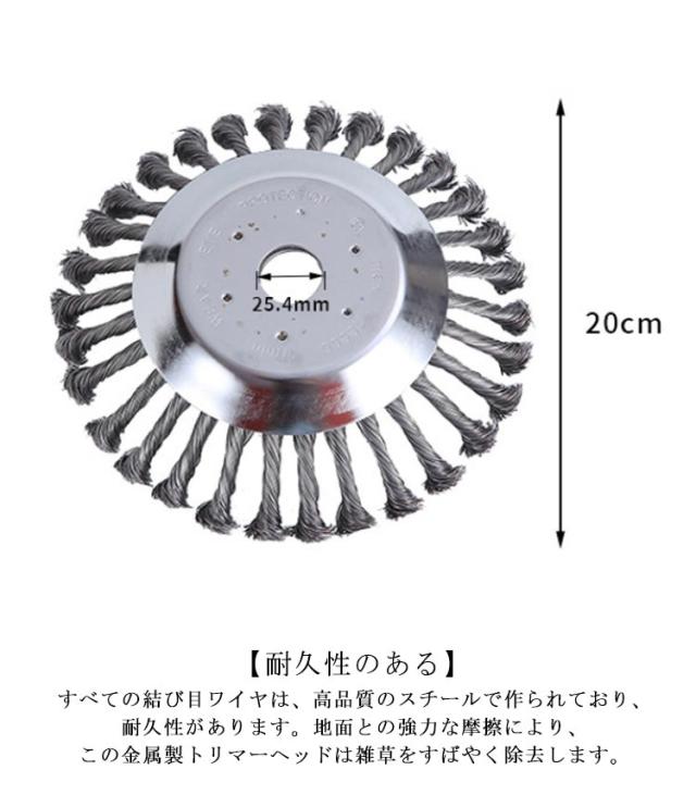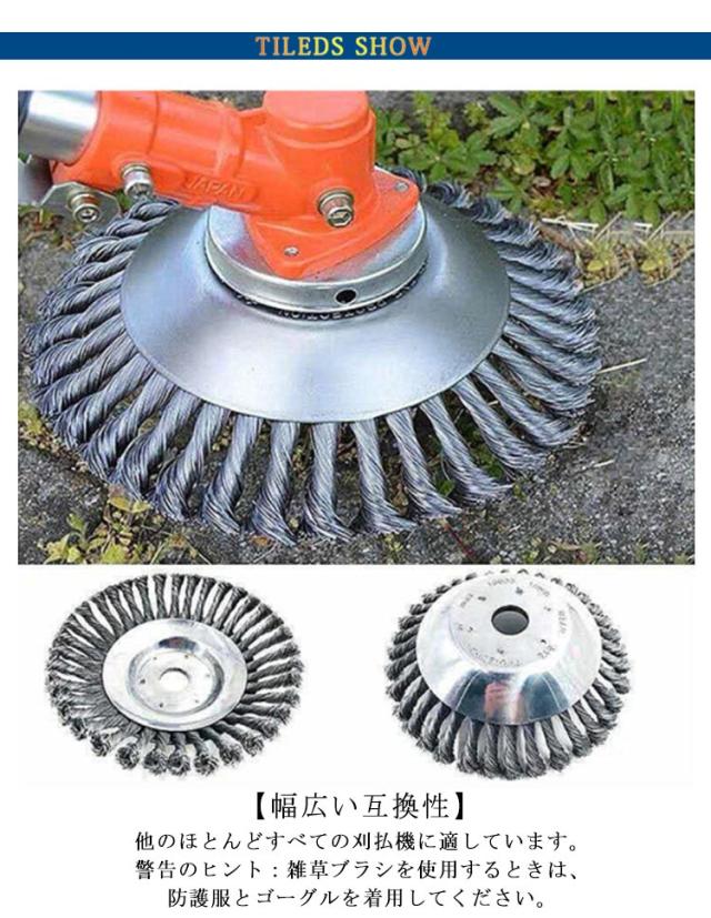 | お庭の手入れに使える草刈り機の交換用ブラシカッター。草刈機用チップソー 【耐久性のある】すべての結び目ワイヤは、高品質のスチールで作られており、耐久性があります。地面との強力な摩擦により、この金属製トリマーヘッドは雑草をすばやく除去します。 【安全に使用】ブレードとは異なり、結んだワイヤーで作られているため、非常に安全に使用できます。 ※スチールワイヤー材氏で擦り傷があるかもしれませんので、ご購入は慎重にお願いいたします。 【幅広い互換性】他のほとんどすべての刈払機に適しています。 警告のヒント:雑草ブラシを使用するときは、防護服とゴーグルを着用してください。 【さまざまな用途】このチップソーは、庭、歩道の草刈だけではなく、レンガの縫い目などに苔取り、バリ取り、粉塵除去、酸化物除去、クリーニングなどにも適しています。石やハードブロックを打つとき、それは正常に動作することができます。 | |