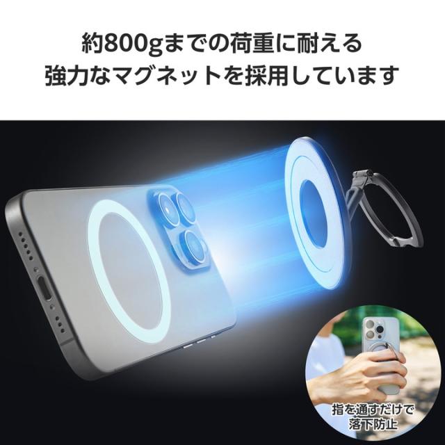 MagSafe対応iphoneの背面に磁石の力で取り付けることができる、MAGKEEPスマホリングです。磁力で着脱できるので、ワイヤレス充電や電子決済に素早く対応できます。厚みが約4mmの薄型タイプのため、本製品を常にスマートフォン本体に取り付けた状態でもコンパクトにお使いいただけます。 リング部分はスタンドとしても使用でき、動画視聴などを快適に楽しめます。