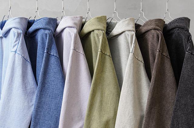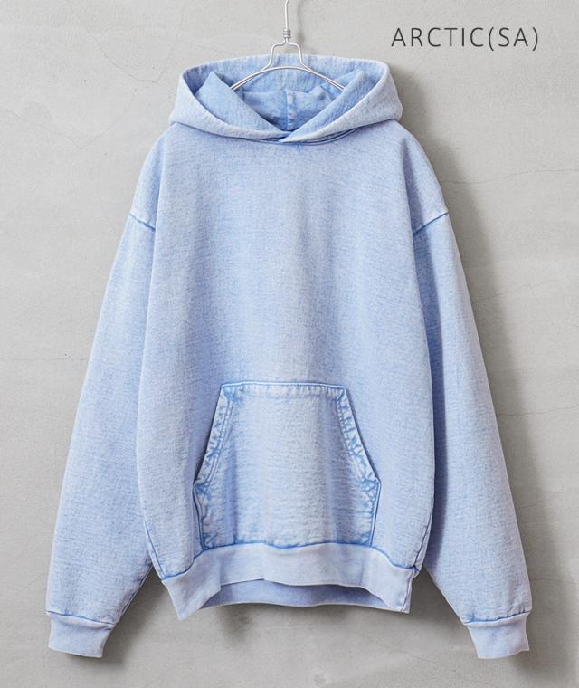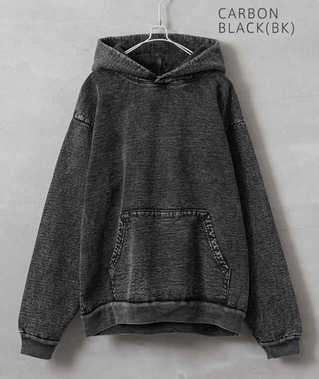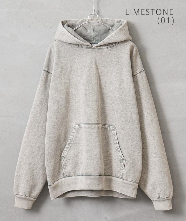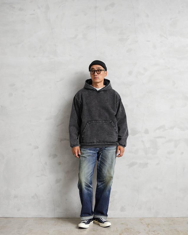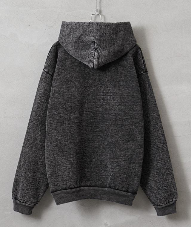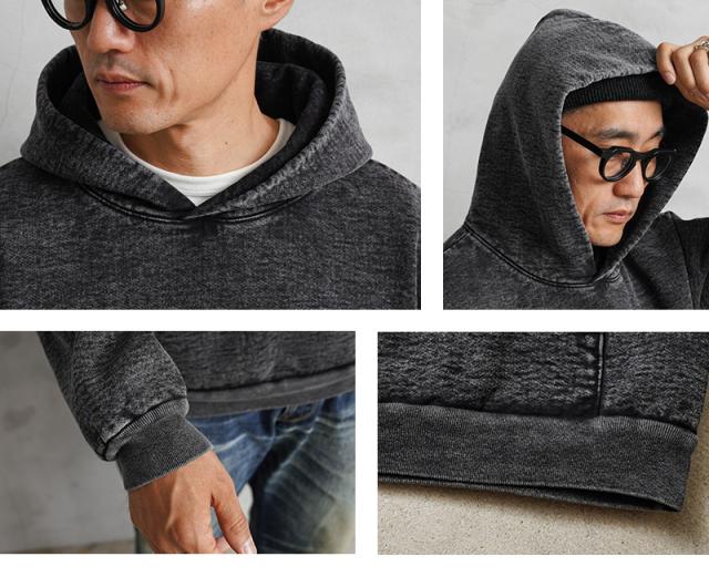 良質な米綿の肉厚な14オンスのヘビーウエイトな生地で、肌触りも良く保温性の高い裏起毛仕様。洗っても縮みにくく型崩れしないシュリンクフリー素材で、フード部分のみ一枚パネルを増やすことで、フード部分の立ち具合がより綺麗に出るのもポイントです。使い古されたような独特の風合いを醸し出すミネラルウォッシュ加工が施されており、タフな生地感と相まって着込む程に味わいの増す一着。