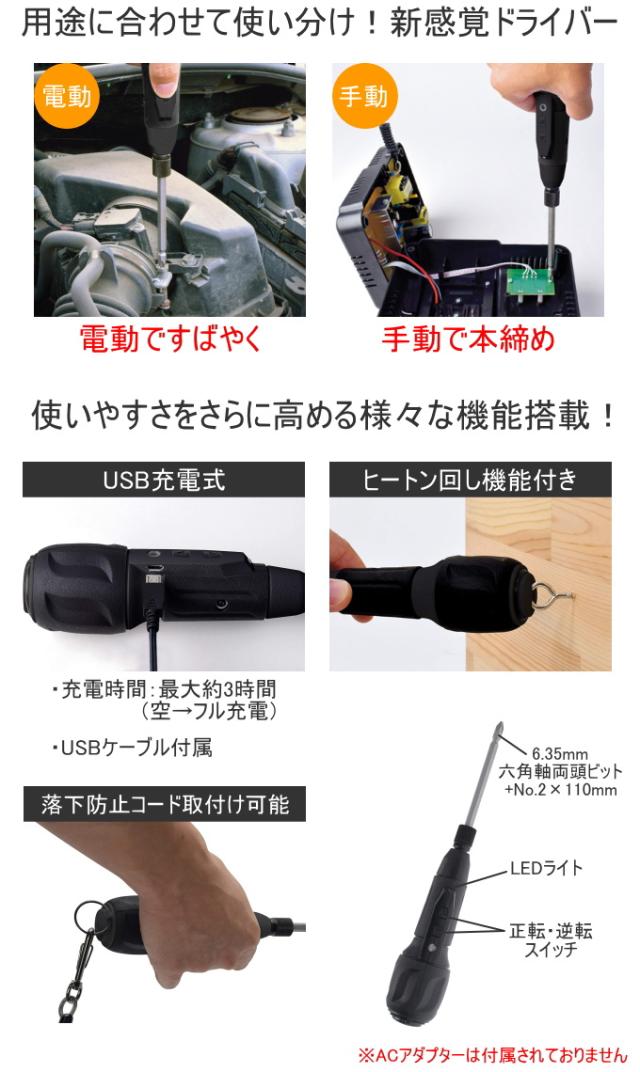 | 特徴 | 用途に合わせて電動と手動を使い分けできる新感覚ドライバー! LEDライト付なので暗いところの作業も安心。 指先で正転・逆転カンタン切り替え。 USB充電式。 ヒートン回し機能付き、落下防止コード取付可能。 ※ACアダプターは付属されておりません。 |