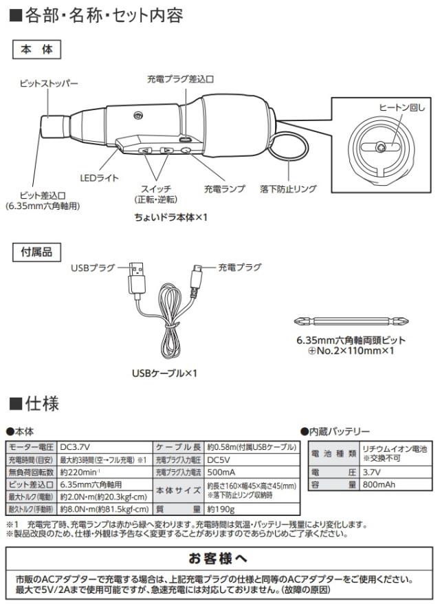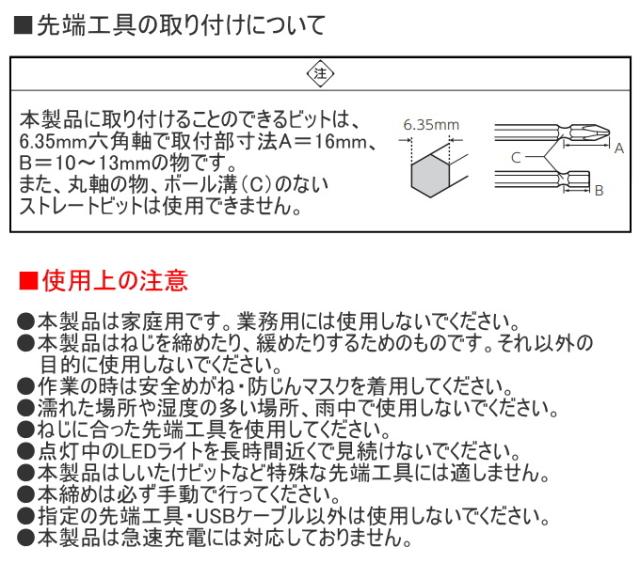 | セット内容 | 本体×1 6.35mm六角軸両頭ビット+No.2×110mm×1 USBコード×1 取扱説明書×1 |