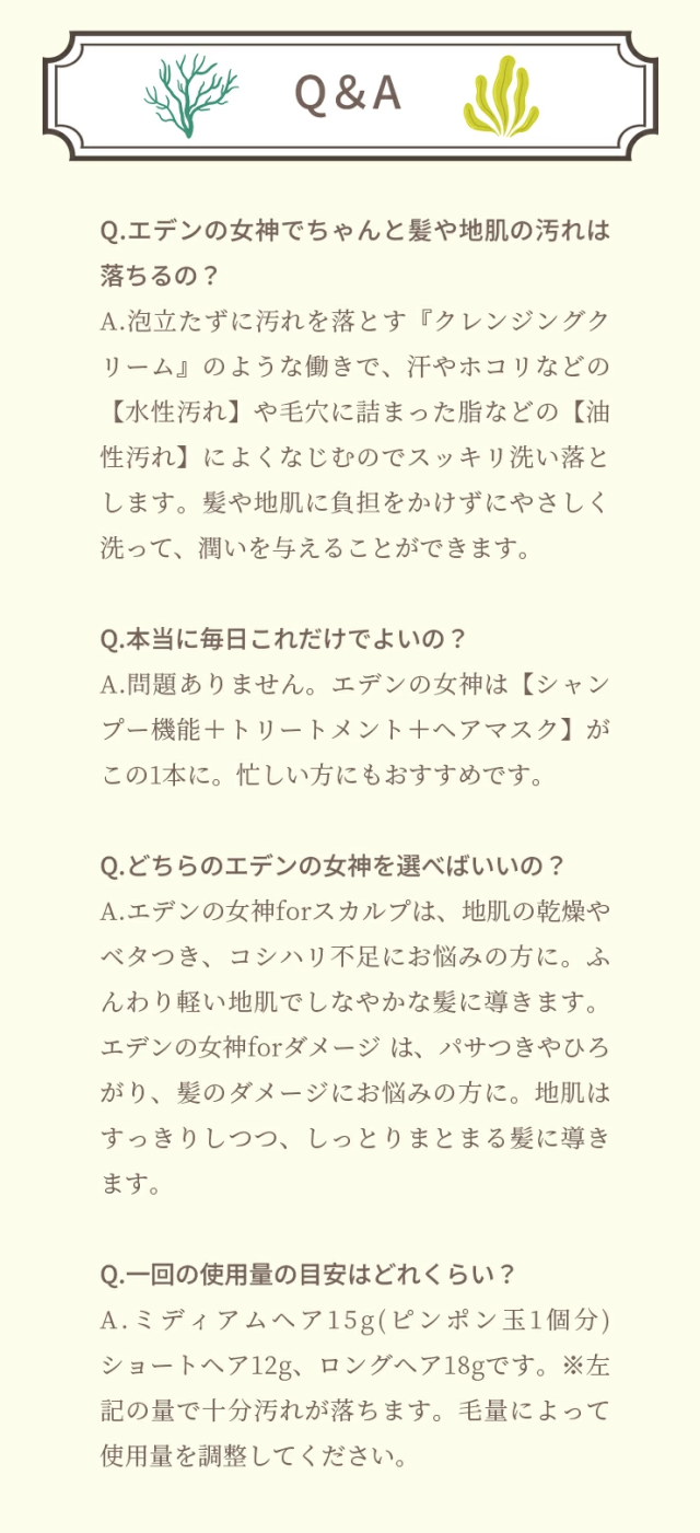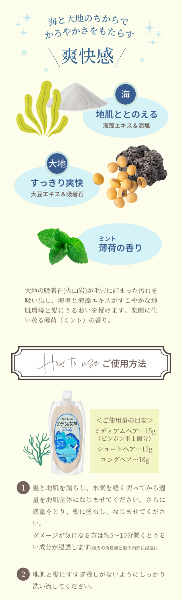 「テラムス エデンの女神」は、髪と地肌のお悩みに合わせて2種類から選べます。ハリコシ不足は「forスカルプ」、パサつきや広がりには「forダメージ」をお使いください。こちらのページはforスカルプです。 テラムス エデンの女神 forスカルプ 280g ×3個セット 日々のシャンプーを極上のヘアケア時間へ。シャンプー・トリートメント・ヘアマスクがひとつで叶う。 「テラムス エデンの女神」は、シャンプーを使わずに髪を洗えるトリートメント。クレンジングクリームのような働きで汚れになじみ、髪も地肌も爽やかに洗い上げます。 「テラムス エデンの女神」を髪と地肌にもみこめば、まるでヘッドスパのような気持ち良さ。 〇クレンジングクリームのように、髪や地肌の汚れをしっかり落とす 〇髪や地肌に負担をかけず、優しく洗う 〇毎日のヘアケアはこれ1本でOK 〇スカルプケア・ダメージケア2種類から選べる <forスカルプ> 大地の吸着石が毛穴に詰まった汚れを吸い出し、海塩と海藻エキスがすこやかな地肌環境と髪にうるおいを授けます。楽園に生い茂る薄荷(ミント)の香り。 海と大地のちからでかろやかさをもたらす、爽快感。 □地肌の乾燥が気になる方 □ベタつく方 □コシハリ不足の方 ・地肌を整える 海藻エキス、海塩 ・すっきり爽快 ダイズエキス、吸着石 ・薄荷(ミント)の香り --------テラムス エデンの女神Q&A-------- Q.エデンの女神でちゃんと髪や地肌の汚れは落ちるの? A.泡立たずに汚れを落とす『クレンジングクリーム』のような働きで、汗やホコリなどの【水性汚れ】や毛穴に詰まった脂などの【油性汚れ】によくなじむのでスッキリ洗い落とします。髪や地肌に負担をかけずにやさしく洗って、潤いを与えることができます。 Q.本当に毎日これだけでよいの? A.問題ありません。エデンの女神は【シャンプー機能+トリートメント+ヘアマスク】がこの1本に。忙しい方にもおすすめです。 Q.どちらのエデンの女神を選べばいいの? A.エデンの女神forスカルプは、地肌の乾燥やベタつき、コシハリ不足にお悩みの方に。ふんわり軽い地肌でしなやかな髪に導きます。エデンの女神forダメージ は、パサつきやひろがり、髪のダメージにお悩みの方に。地肌はすっきりしつつ、しっとりまとまる髪に導きます。 Q.一回の使用量の目安はどれくらい? A.ミディアムヘア15g(ピンポン玉1個分)ショートヘア12g、ロングヘア18gです。※左記の量で十分汚れが落ちます。毛量によって使用量を調整してください。 【お試し】テラムス エデンの女神 forスカルプ 1回分 はこちら 【お試し】テラムス エデンの女神 forダメージ 1回分 はこちら |