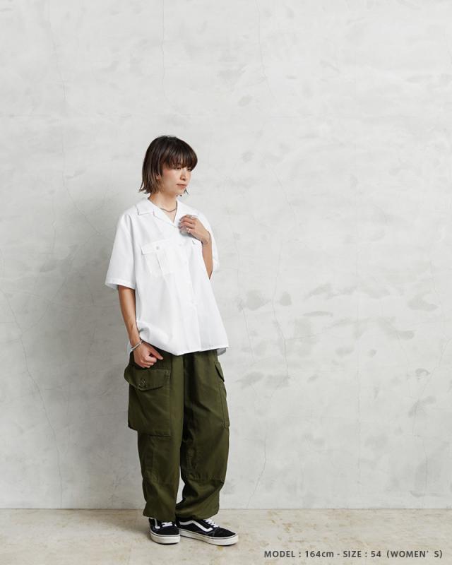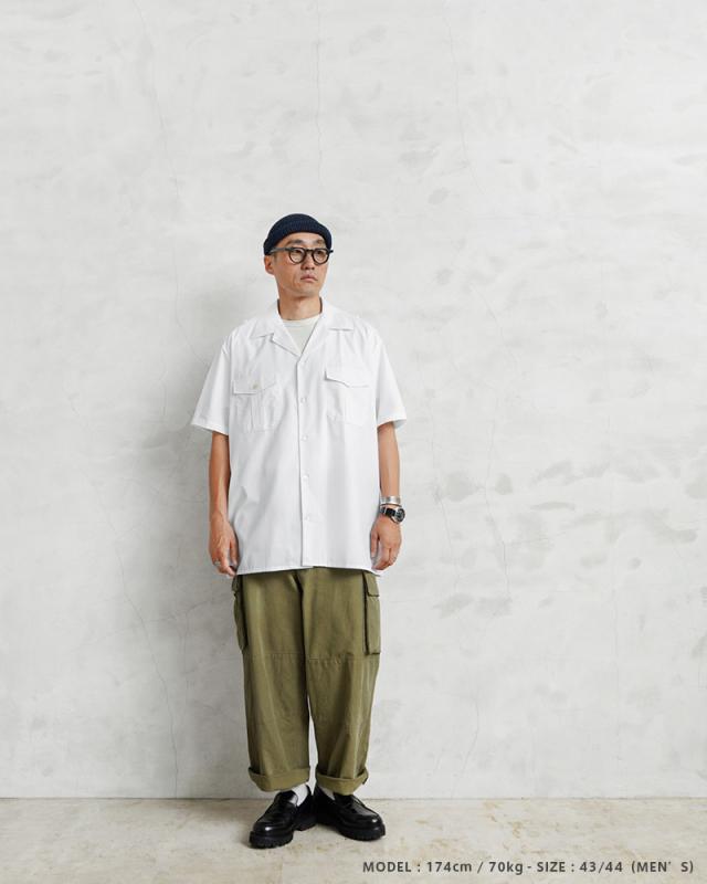 | 商品説明 | 実物 新品 デッドストック フランス軍 MARINE NATIONALE ショートスリーブ ホワイト シャツのご紹介です。 フランス海軍で使用されるオープンカラーのホワイトシャツです。素材やディテールが若干異なるものの、伝統的に着用されているシャツで、1990年代頃のアイテムが中心に入荷しています。 前合わせの異なるメンズ、レディース仕様があり、レディースの身幅広めで若干ショート丈なサイズがお好みの男性にはぜひ、レディース仕様をあえて着ていただくのもおすすめです。 ボタン留めできるボックスプリーツのフラップポケットが両胸に配置されたシンプルなデザイン。ボタンには生成り系の高級感のあるボタンが使用されています。 肩には肩章用のループが付いていますので、エポレットとはまた違う雰囲気で、アクセントになっています。耐久性が必要な背面のヨークは二重に補強が施されており、フラットな裾はタックインでもタックアウトでも着れるデザインになっています。 コットン、ポリエステルを使用した程よくハリのある風合いで、速乾性があり、シワになりにくいイージーケア素材を使用。ゆったりとしたシルエットで今っぽく着れるオーセンティックな作りのホワイトシャツです。 | ||||||||||||||||||||||||||||||||||||