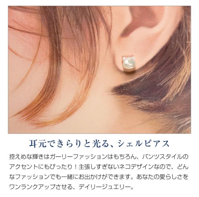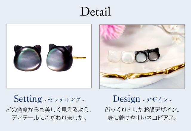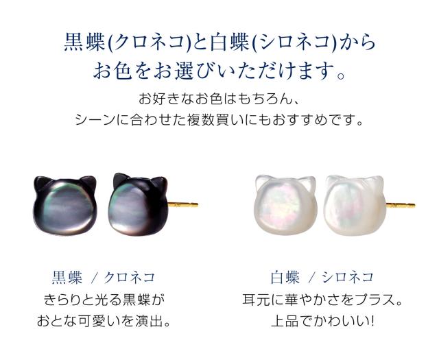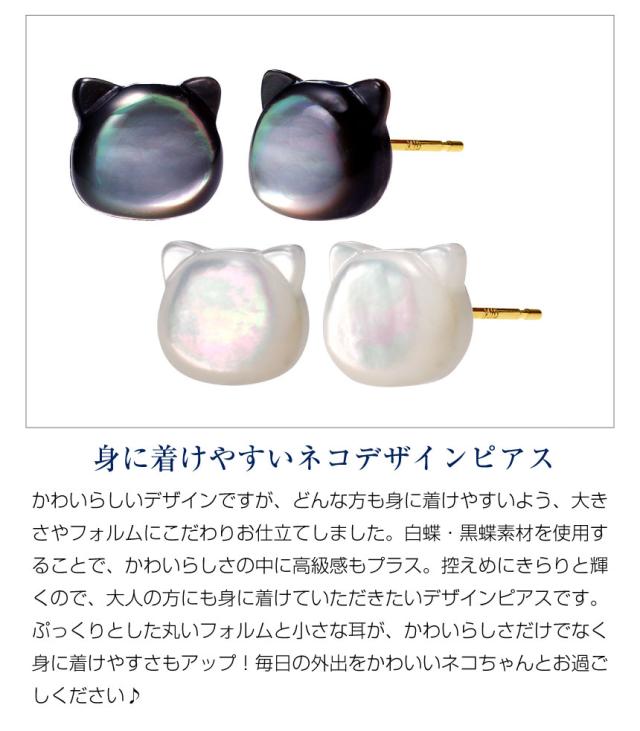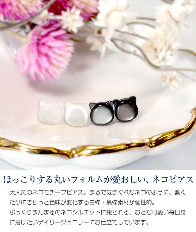 大人気のネコモチーフピアス。まるで気まぐれなネコのように、動くたびにきらっと色味が変化する白蝶・黒蝶素材が個性的。