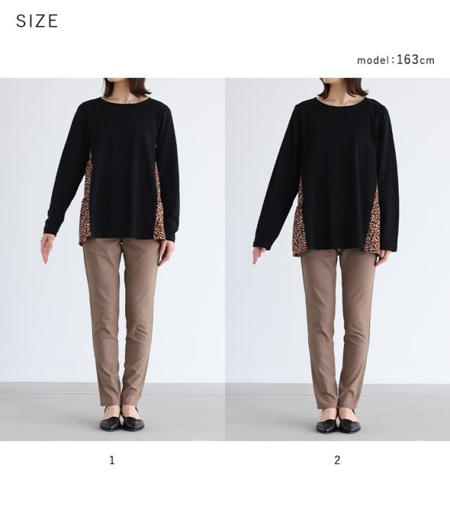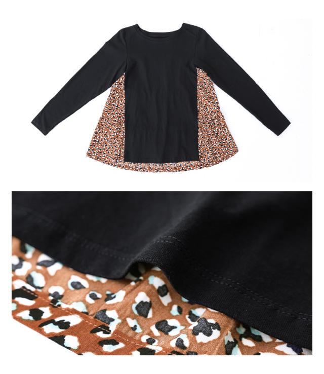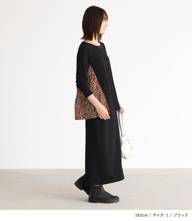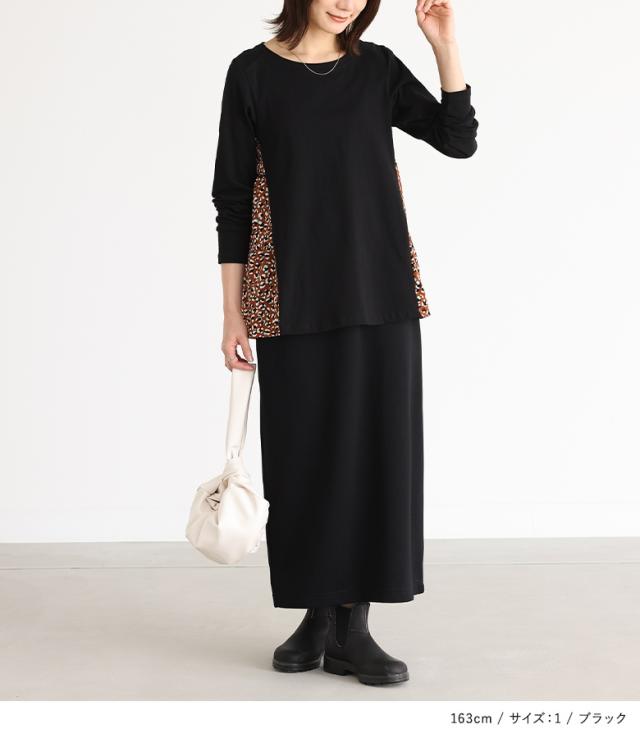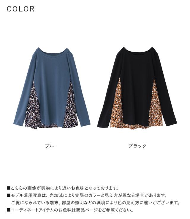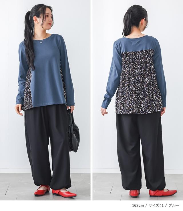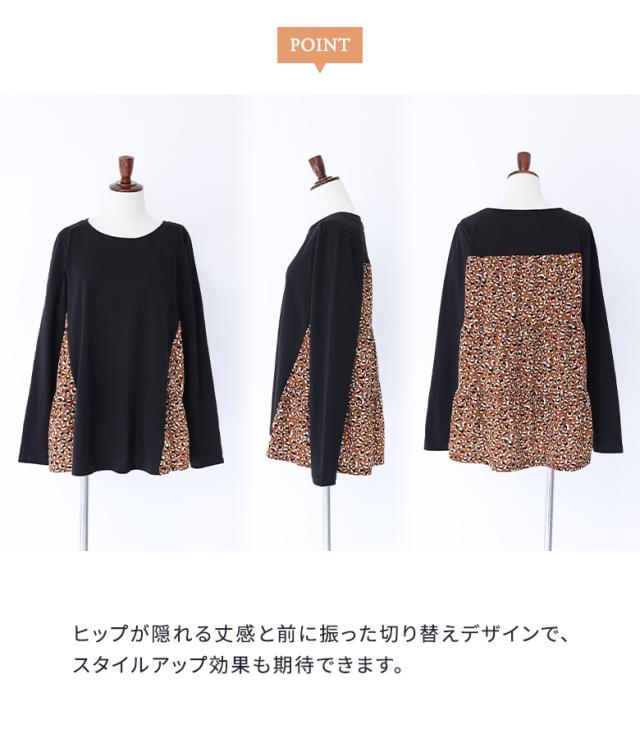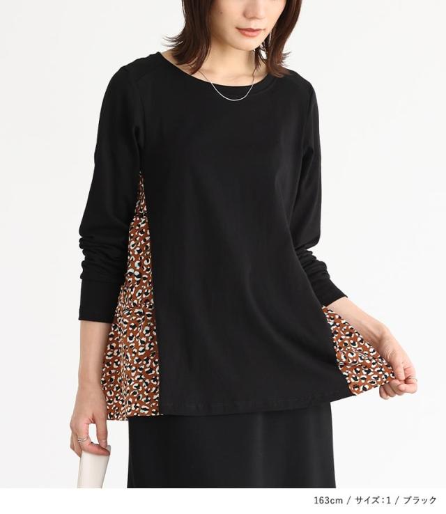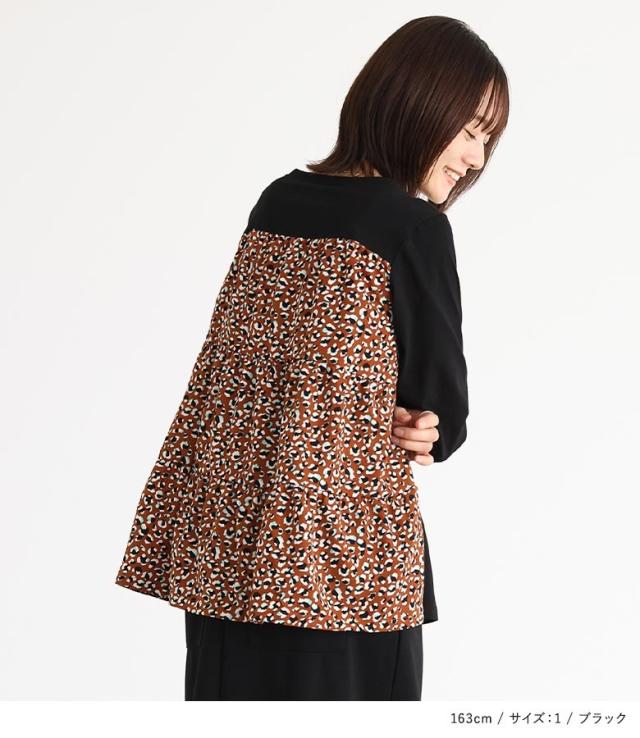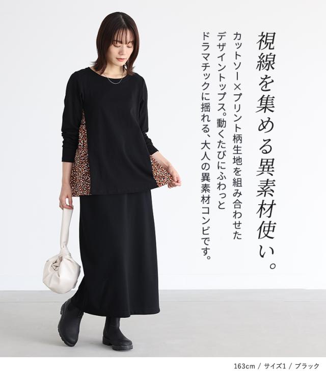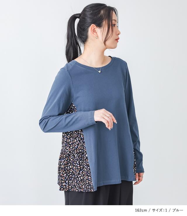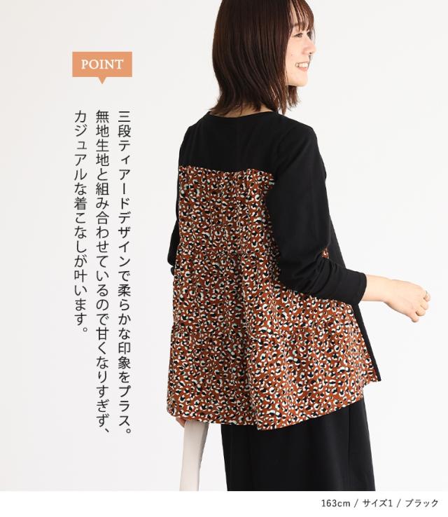 『異素材ティアードカットソー』※メール便可※【10】トップス カットソー レディース 長袖 異素材 ティアード プリント柄 デザイン コットン100% 綿100% コットン 綿 布帛生地 三段ティアード カジュアル お尻が隠れる 体型カバー