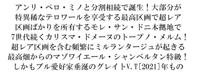 アンリ・ペロ・ミノと分割相続で誕生!大部分が 特異稀なテロワールを享受する最高区画で超レア 区画ばかりを所有するモレ・サン・ドニ本拠地で 7世代続くカリスマ・ドメーヌのトープノ・メルム! 超レア区画を含む頻繁にミルランタージュが起きる 最高畑からのマゾワイエール・シャンベルタン特級! しかもブル愛好家垂涎のグレイトV.T[2021]年もの