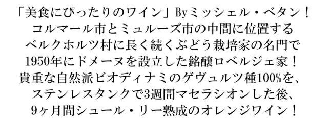 「美食にぴったりのワイン」Byミッシェル・ベタン! コルマール市とミュルーズ市の中間に位置する ベルクホルツ村に長く続くぶどう栽培家の名門で 1950年にドメーヌを設立した銘醸ロベルジェ家! 貴重な自然派ビオディナミのゲヴュルツ種100%を、 ステンレスタンクで3週間マセラシオンした後、 9ヶ月間シュール・リー熟成のオレンジワイン!