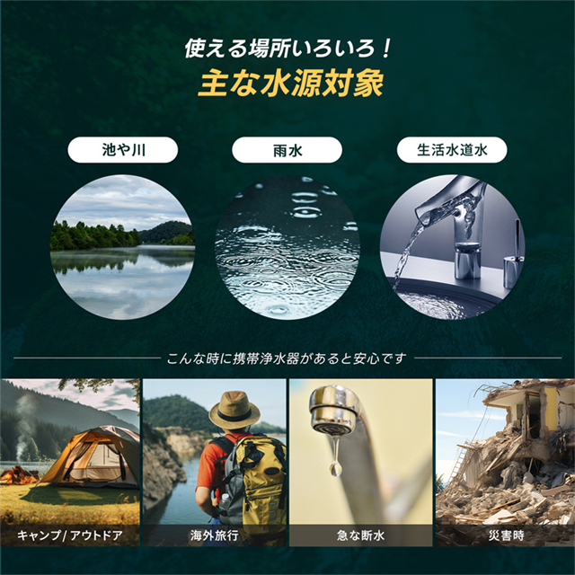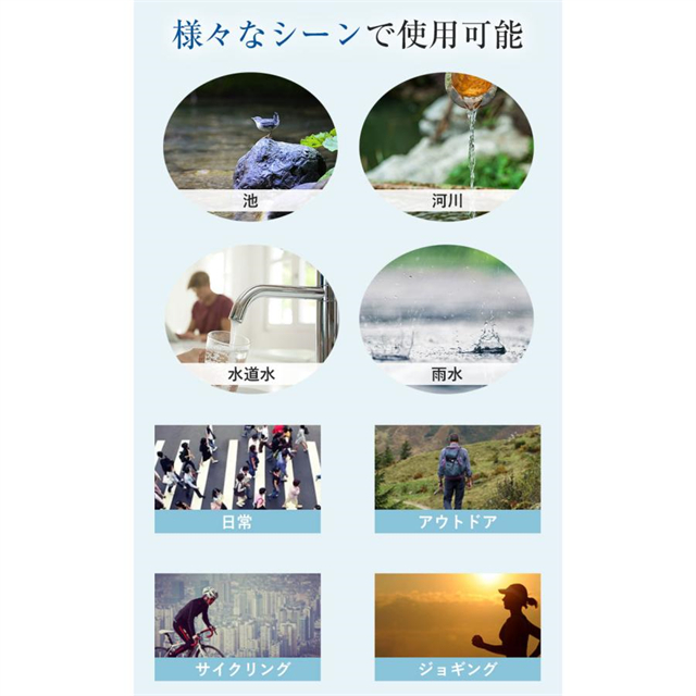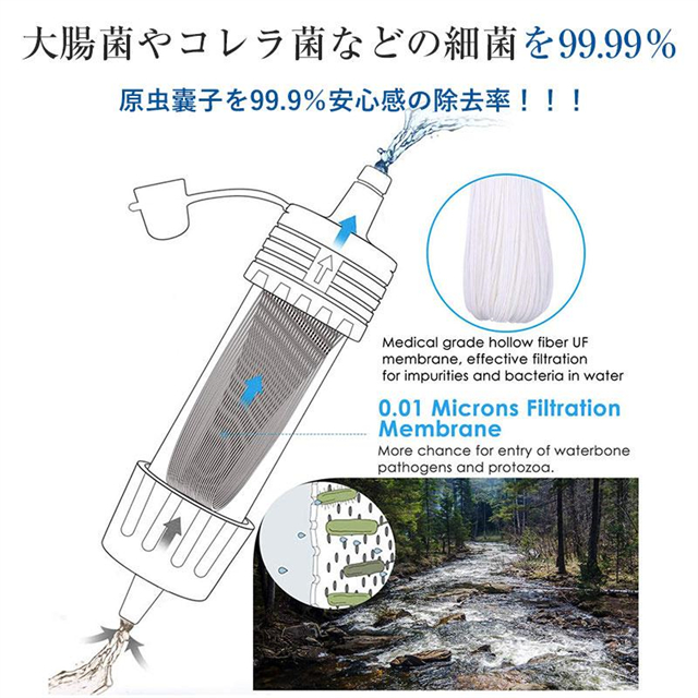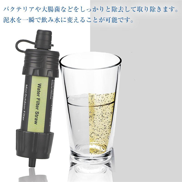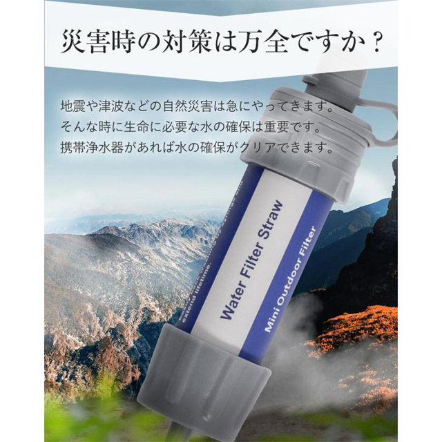 | 商品説明 | ◆【大切な家族を災害から守る!】アウトドア、キャンプ、旅行時地には川やため池の水などを、また、地震や津波、台風などの自然災害が発生した緊急時はお風呂の残り水を清潔な飲料水までろ過することができます。大切な家族の為の災害時の備え! 緊急用に一つ常備しておくことをおすすめします。 【水質基準に厳しい水のプロ監修】池の水、川、湖、お風呂の残り水などそのまま飲むのはかなりの不安が。携帯浄水器があれば、中空糸膜フィルターが細菌や原虫嚢子をしっかり除去し、安心安全で清潔な飲料水へとろ過します。防災グッズとしての備蓄にもおすすめです。 【持ち運びに便利&軽量コンパクト設計】コンパクトなデザインで重さわずか133gのポータブルデバイスです。安全に保管できる専用の収納袋が付いており、防災リュックに是非1つ入れておくことが推奨されています。アウトドア、キャンプ、登山、釣り、サバイバル、防災、災害時と様々な場面で役立つ携帯用浄水器です。 |