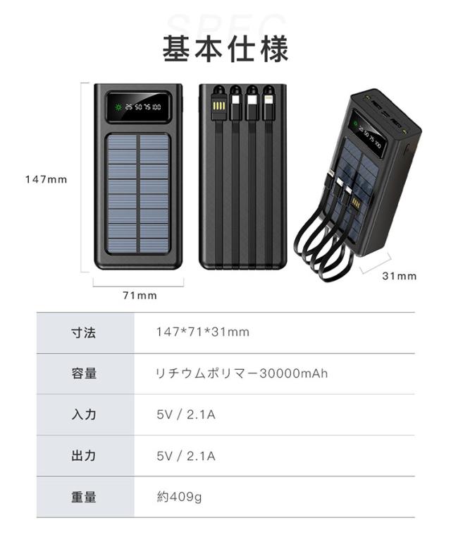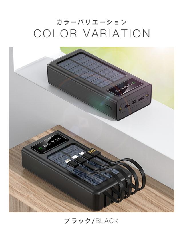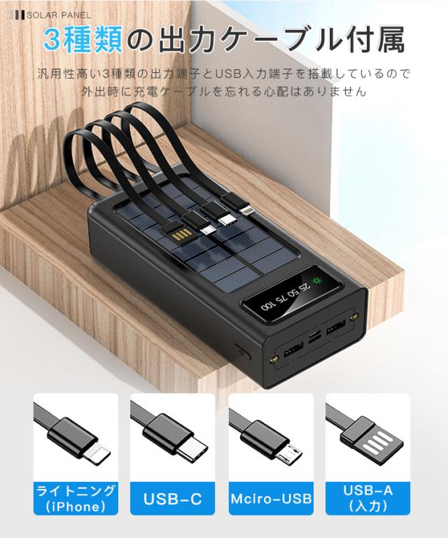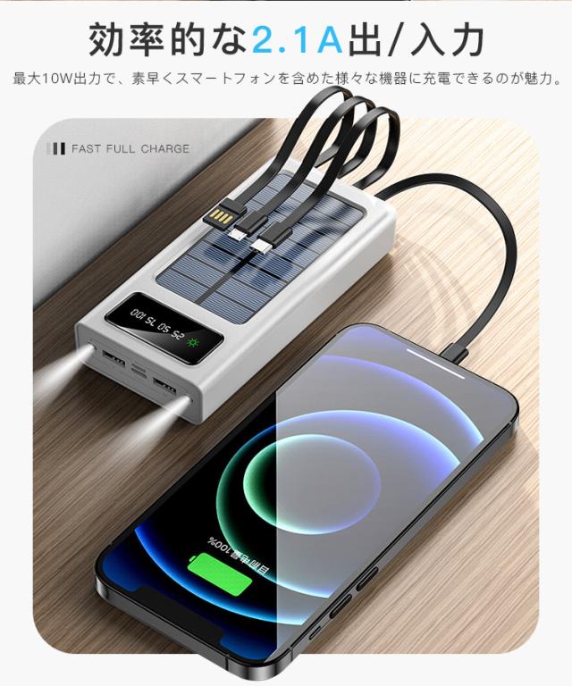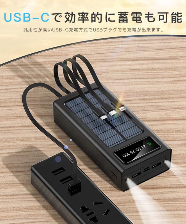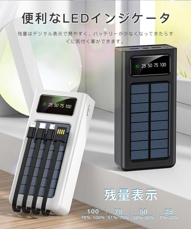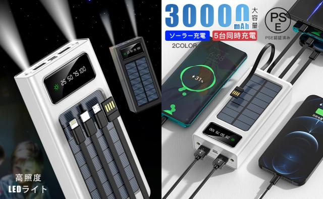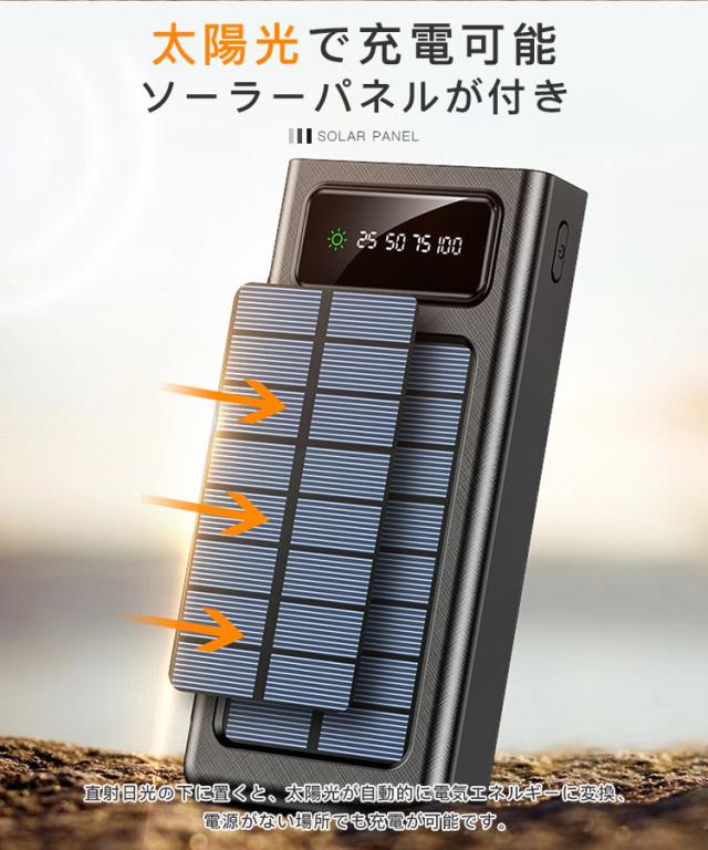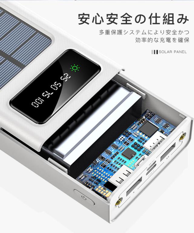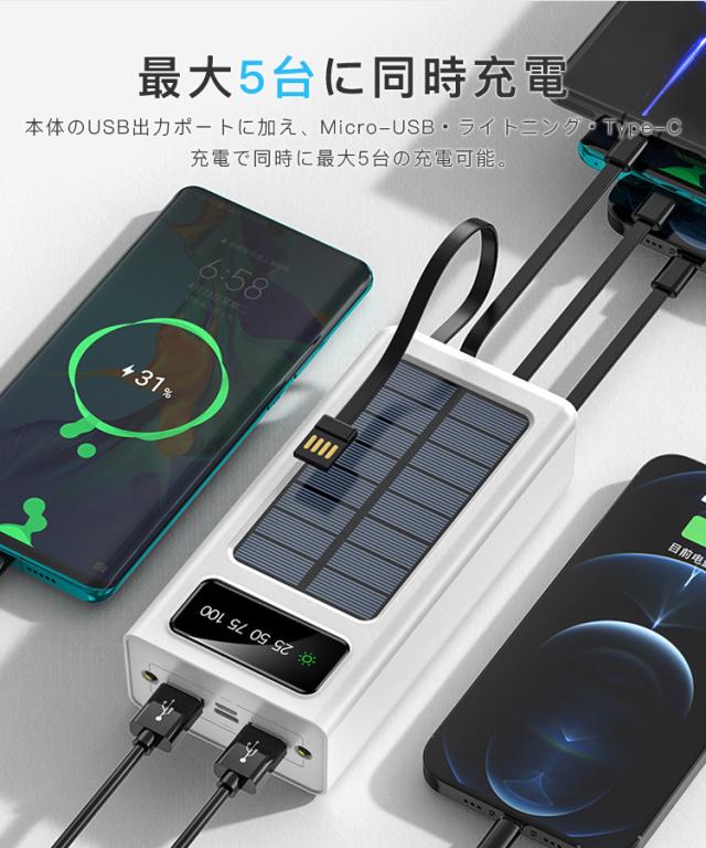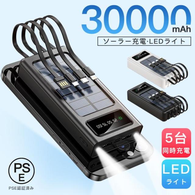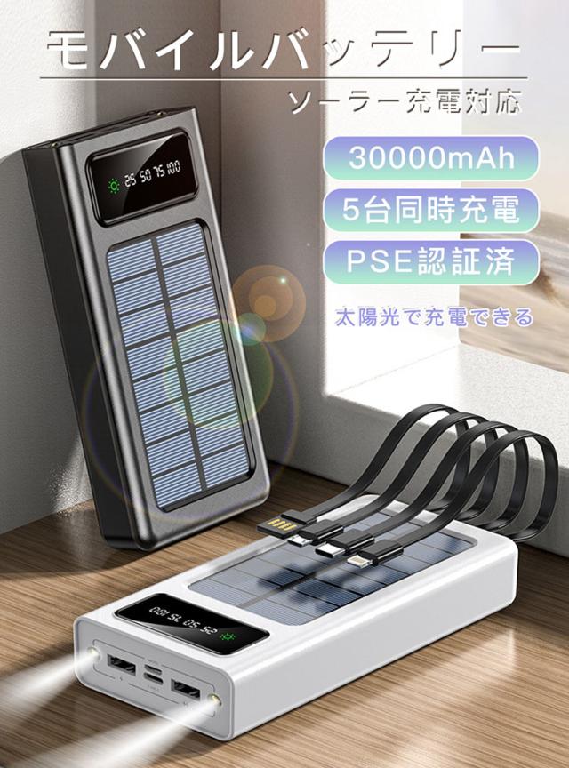 モバイルバッテリー 大容量 ソーラー充電 30000mAh LEDライト 夜道 旅行 出張 5台同時充電 太陽光で充電 持ち運び PSE認証済 防災 2024