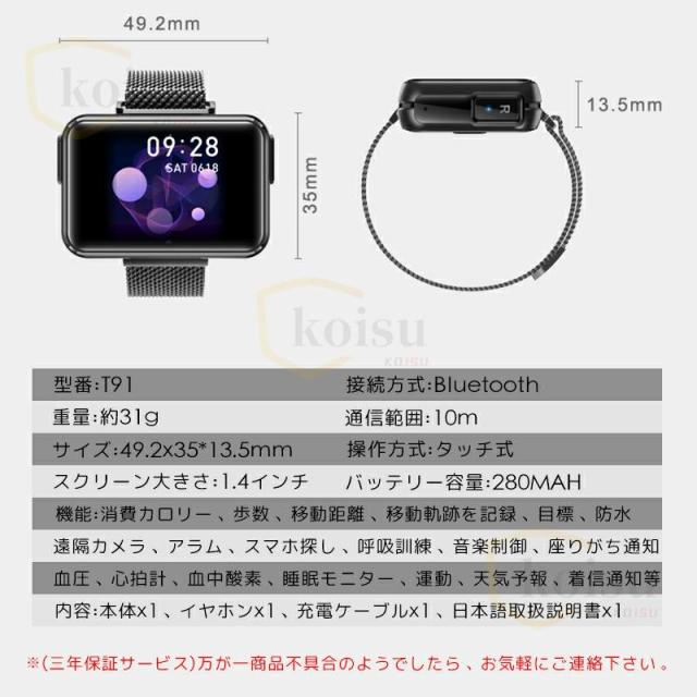スマートウォッチ T91 日本製センサーじしん警報 SOS緊急電話 通話機能 内蔵Bluetoothヘッドセット 24時間健康管理 呼吸率 体温 睡眠 LINE着信通知 2024新規