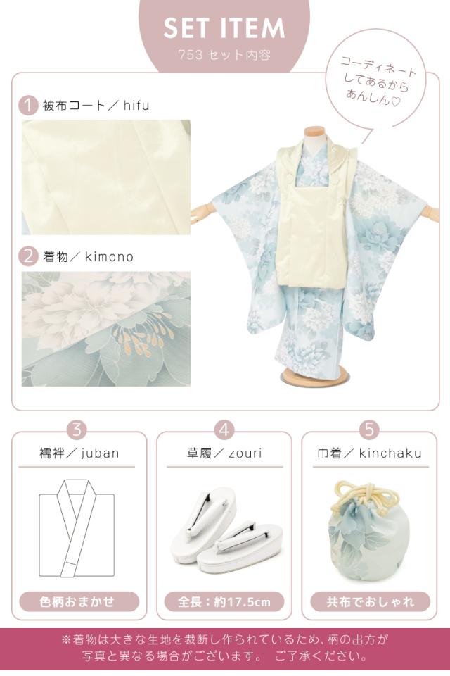 内容は【被布コート・着物(重ね衿縫付済)・襦袢・草履・巾着】です。