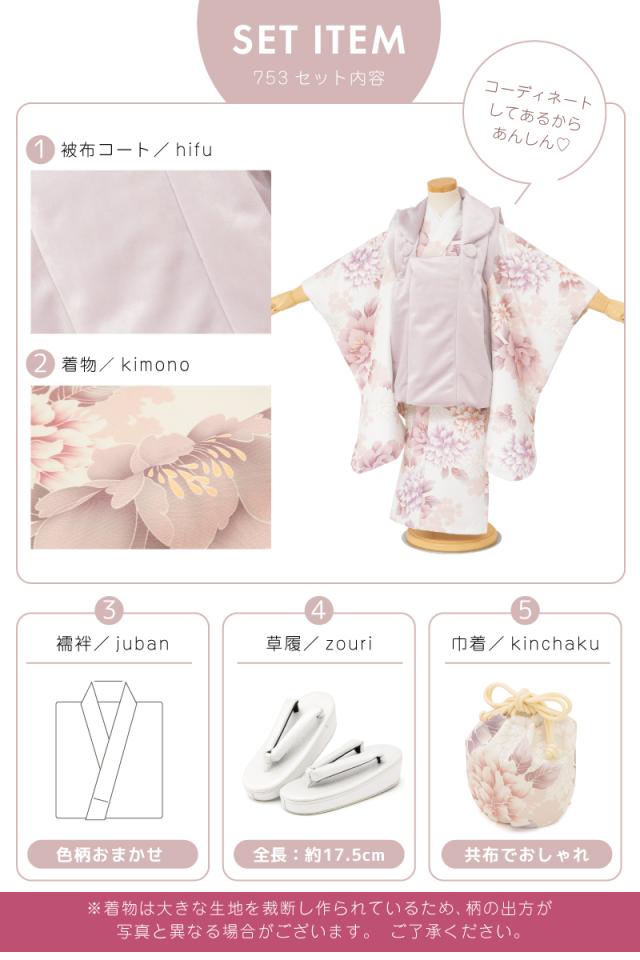 内容は【被布コート・着物(重ね衿縫付済)・襦袢・草履・巾着】です。