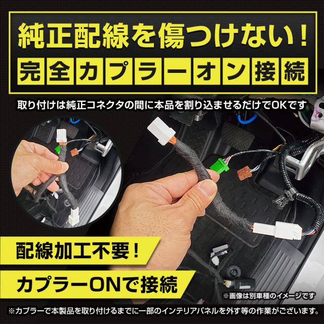 | 純正のコネクタに商品を接続するだけですので、配線加工や結線作業はありません。 |