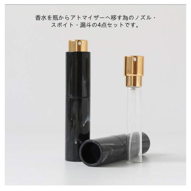 | ノズル・スポイト・漏斗付き コンパクト&スリムなデザインで化粧ポーチにも入れやすい♪ 香水を瓶からアトマイザーへ移す為のノズル・スポイト・漏斗の4点セットです。 容量は8mlと軽く、飛行機での搭乗も可能で、携帯に便利です。 ケースとボトルが分離できるので、詰め替えや残量が確認しやすいなど、 かわいいだけでなく、使いやすい工夫がされています。 香水と一緒にプレゼントしても◎ | |