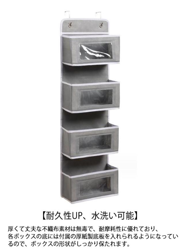 | 納されているものを見えやすく、財布やカバン、スカーフ、ヘアアクセサリー、おもちゃ、雑誌 などの出し入れも便利です。 【大容量、省スペース】 衣類、財布、本、化粧品、おもちゃなど、日常生活に必要なあらゆる種類のアイテムを収納できます。 これらの小さなアイテムを1つずつ整理するのに便利で、すべての製品が散らかって見つけにくくなることがなくなります。 使わないシーズンは折りたたんでペタンコになるため、携帯と収納場所に困りません。 【耐久性UP、水洗い可能】 厚くて丈夫な不織布素材は無毒で、耐摩耗性に優れており、 各ボックスの底には付属の厚紙製底板を入れられるようになっているので、ボックスの形状がしっかり保たれます。 ポケット部分の幅が手前側に広いので、結構な量を入れられて使いやすい。 金属フックが2つ付いているので、フックが錆びて収納袋が汚れる心配はありません。 手洗いが可能なので汚れても手軽にお手入れができます。洗濯機&脱水&乾燥機のご使用はお控えください。 | |