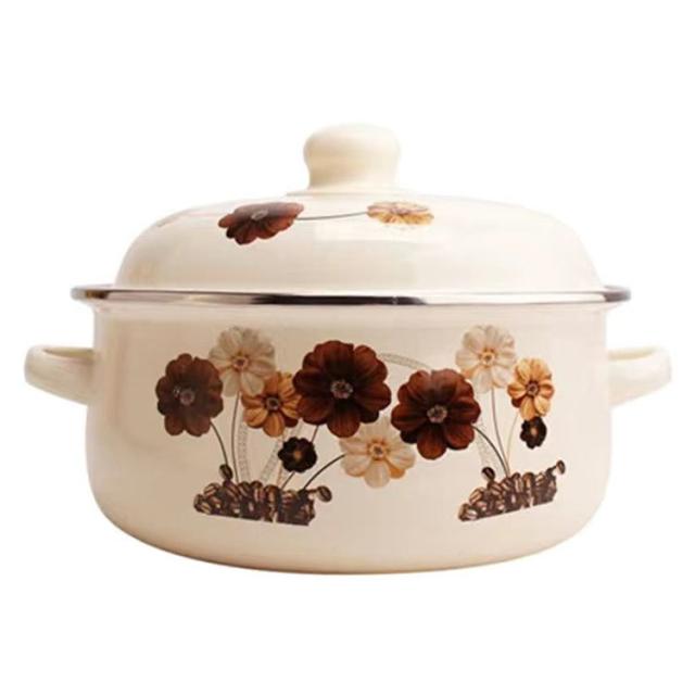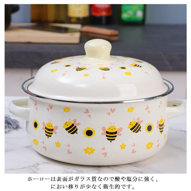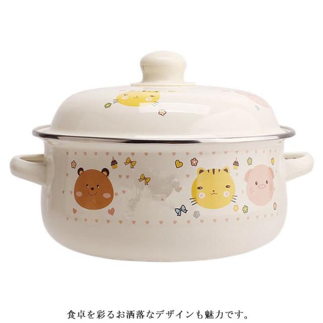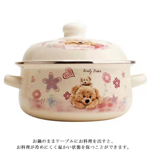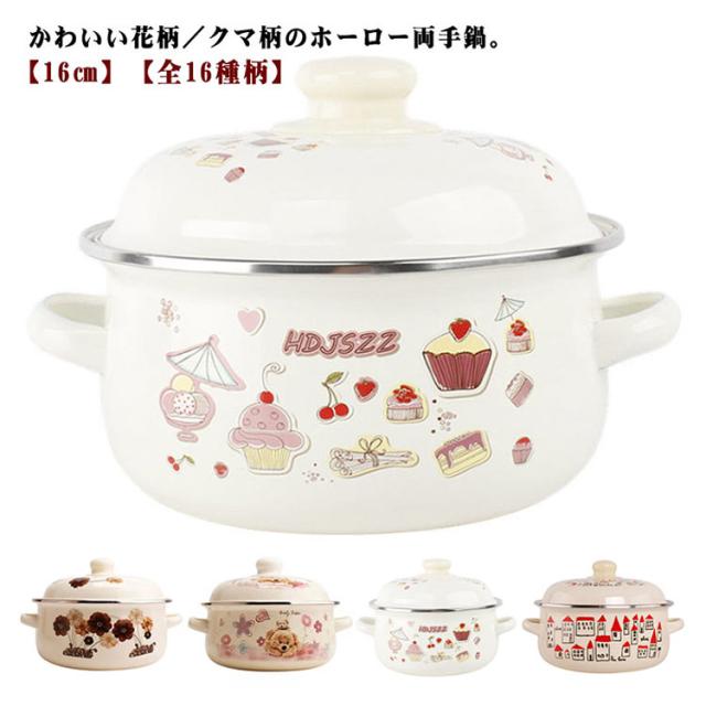 | かわいい花柄/クマ柄のホーロー両手鍋。【16cm】【全16種柄】 ホーローは表面がガラス質なので酸や塩分に強く、におい移りが少なく衛生的です。 耐熱性が高く保温性にも優れていますので、カレー、シチュー、ポトフなどの煮込み料理にも最適です。 食卓を彩るお洒落なデザインも魅力です。 お鍋のままテーブルにお料理を出すと、お料理が冷めにくく温かい状態を保つことができます。 ガス火はもちろん、IHにもお使いいただけます。 | |
