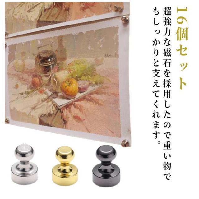 屋内 マグネットフック 16個セット 12×16mm 画鋲 おしゃれ キッチン 浴室 マグネットフック 強力マグネットフック 超強力 屋外 マグネット フック 付き ブラック ゴールド シルバー