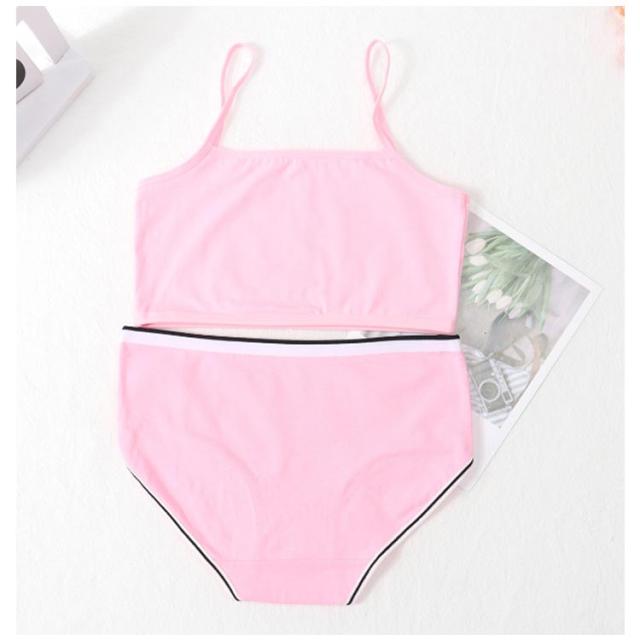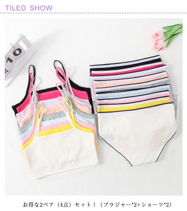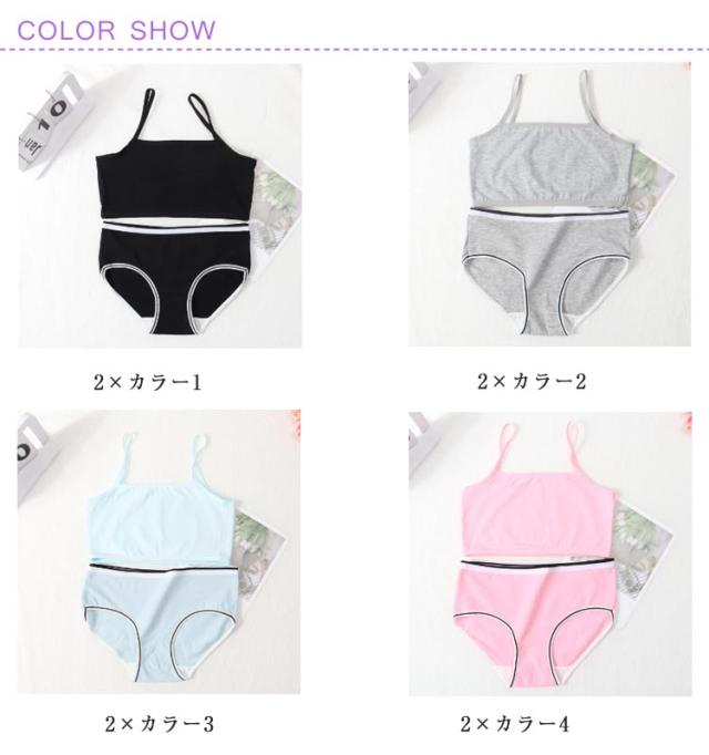 | 小学生高学年〜中学生向け女の子用下着上下2点セットです。 お得な2ペア(4点)セット!(ブラジャー*2+ショーツ*2) 綿混素材で気持ちいい肌触り。 修学旅行・水泳・スイミング・部活・体育やお泊り会におすすめのジュニア向けアウターセット。 伸縮性のあるノンストレスな着心地。 新学期や新年に向けて新しい下着セットは色違いでも欲しくなっちゃう! | |