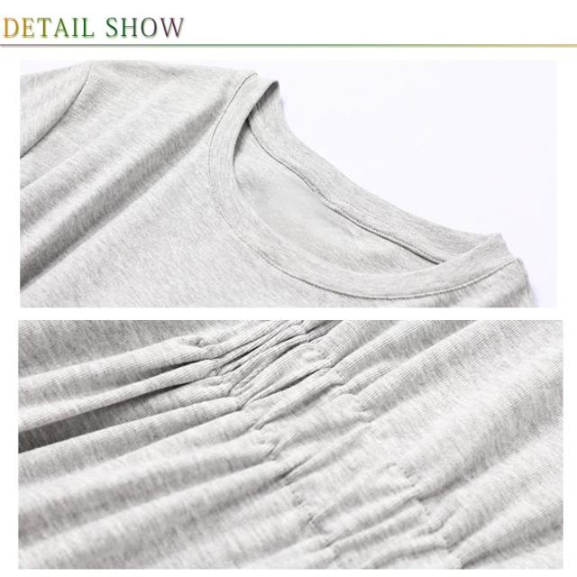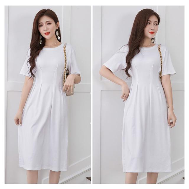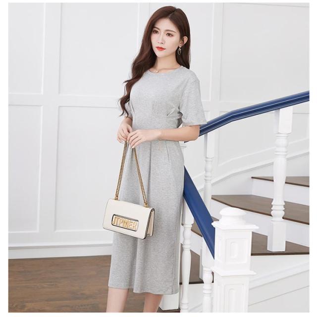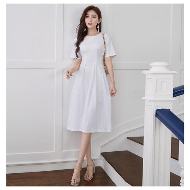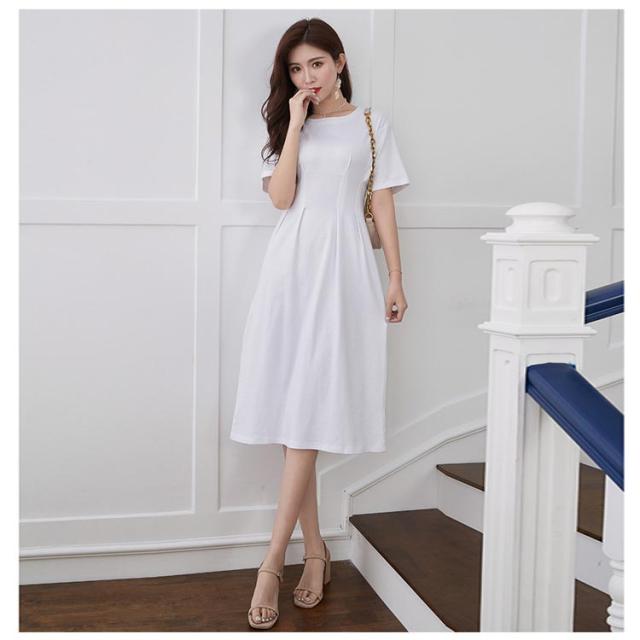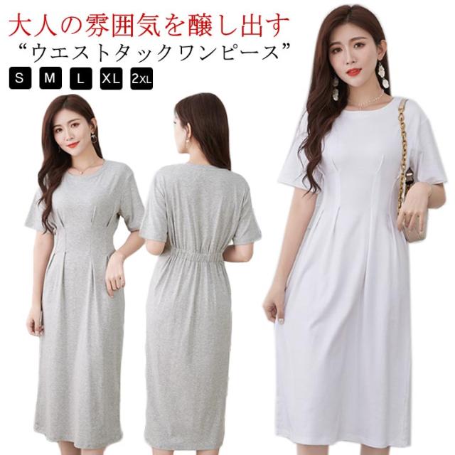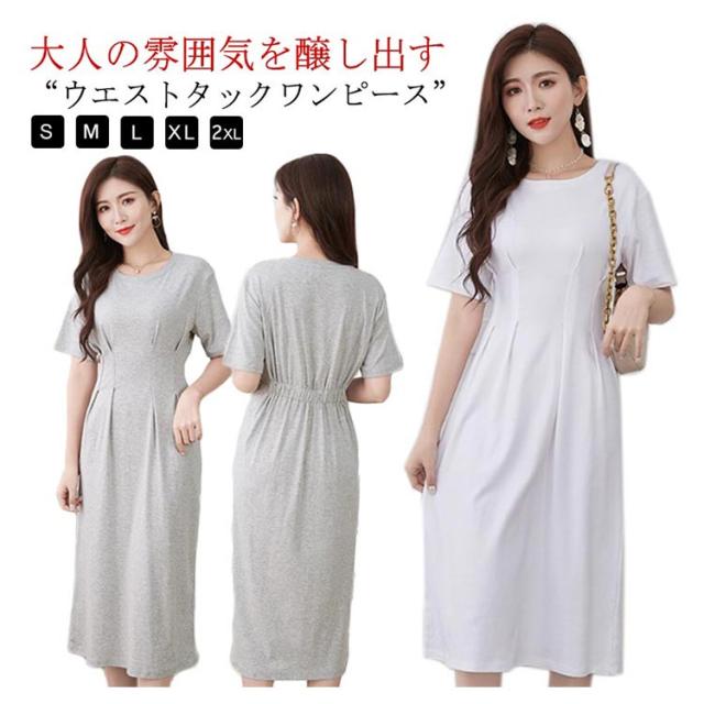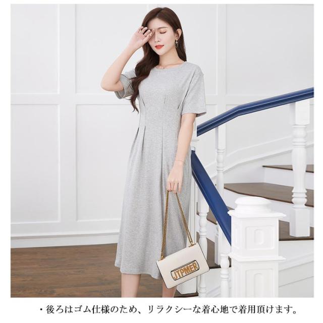 オフィスカジュアル 丸首 綿 ロングワンピース コットン 半袖 ロング クルーネック ウエストタック Aライン ワンピース シンプル レディース きれいめ 上品 通勤 無地 春 夏