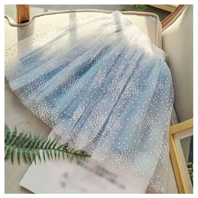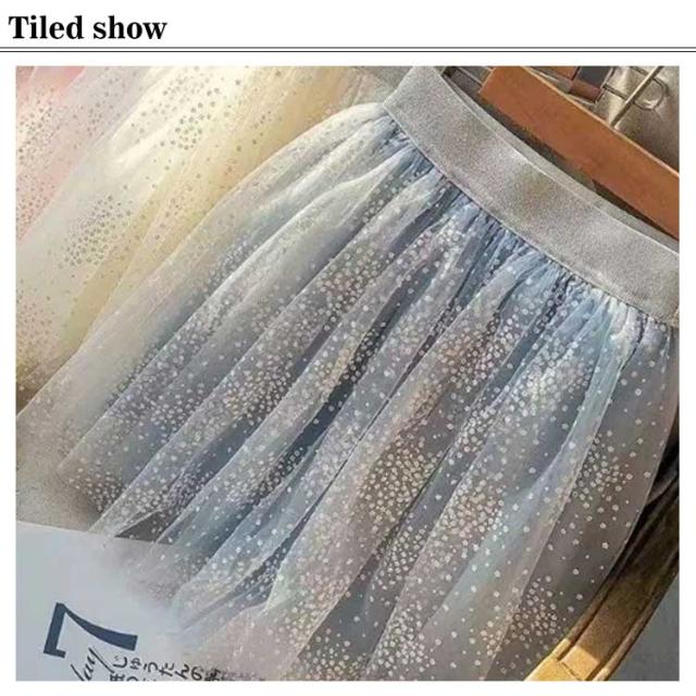 | グレイッシュトーンのふわふわチュールスカートです。 膝が隠れる長さが上品な感じでしょ。 ウエストはゴムで、着心地だけでなくおしゃれ感にもこだわりました。 | |