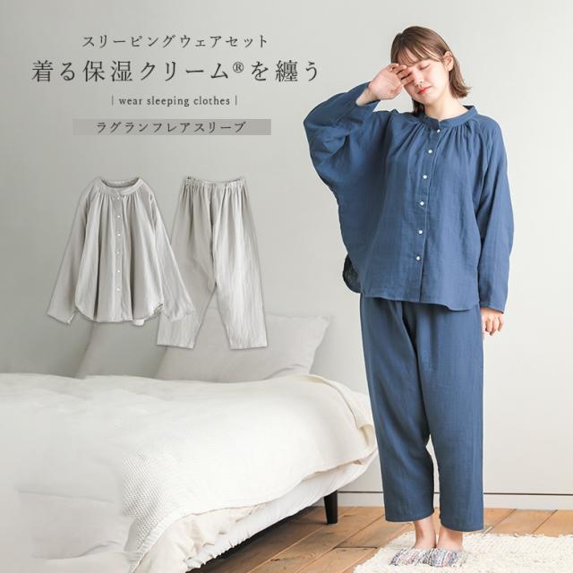 23日最大1200円クーポン 『ラグランフレアスリーブスリーピングウェア』【メール便不可】【20】[パジャマ レディース ルームウェア 綿100% 前開き 長袖 ダブルガーゼ コットン 無地 ナイトウェア 上下セット セットアップ 部屋着 着る保湿クリーム ロングパンツ 柔らか]