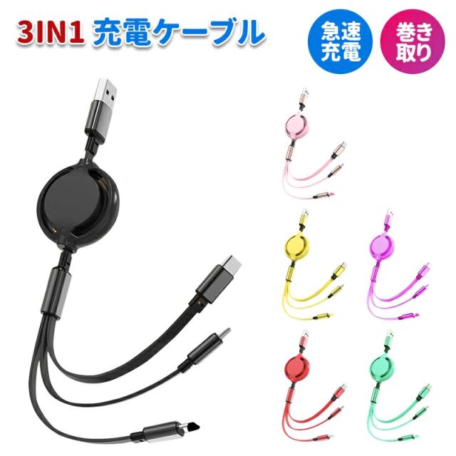USB 3in1 充電ケーブル 3in1 巻き取り ケーブル iPhone 充電ケーブル iPhone 12 Pro Max USBケーブル 巻き取り USB Type-c 巻取り 充電 Android 一本三役 iPhone 12/12 Pro 3A 急速充電 在宅勤務 プレゼント