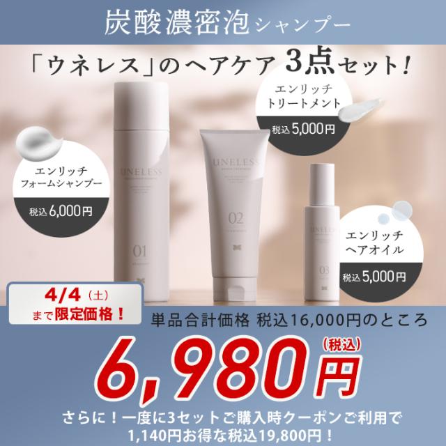 【3セット購入時クーポン利用で4,140円引き!円】UNELESS ウネレス 特別セット 送料無料! 益若つばさ 通販スクープ テレビ朝日 テレ朝通販 ロッピング 炭酸シャンプー トリートメント オイル スカルプケア