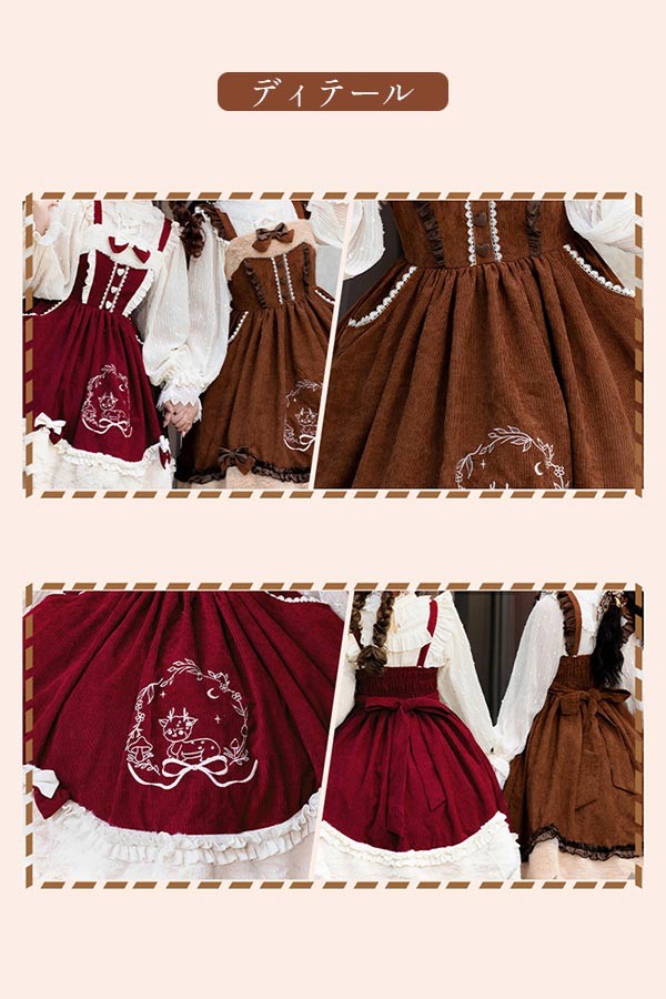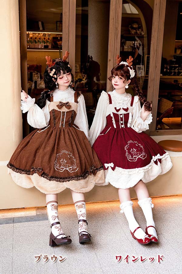 Lolita JSK ロリータ 鹿 刺繍 コーデュロイ 秋野鹿鳴 お姫様 プリンセス リボン本 シアー レースエッジ Aライン ハイウエスト 着?せ 撮影着 可愛い ワンピース S L