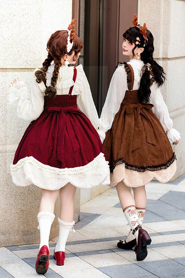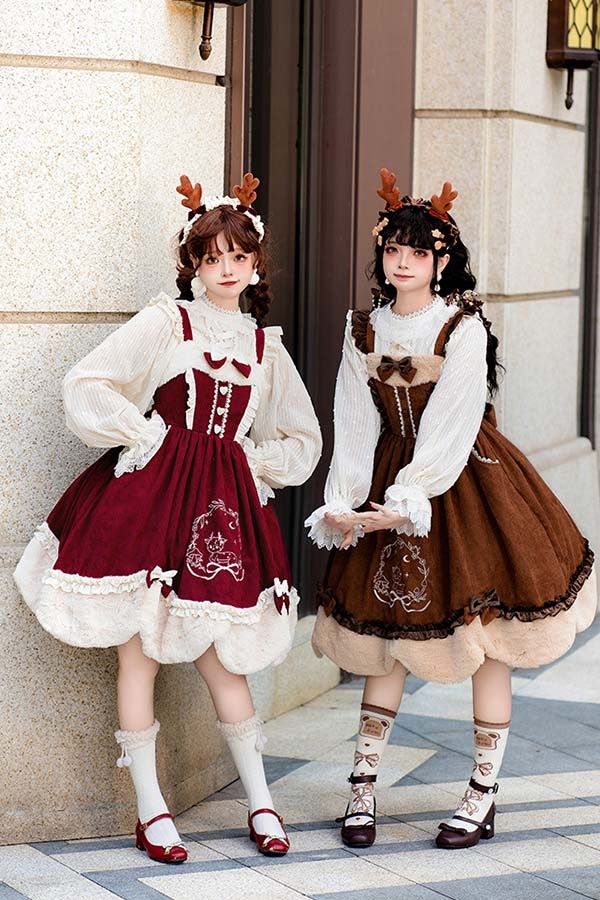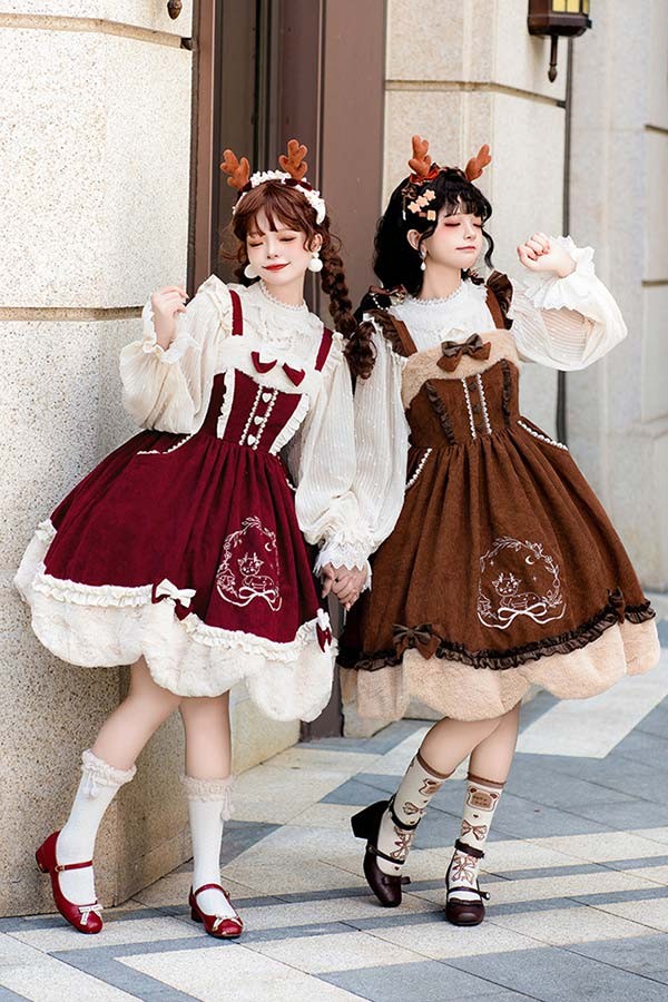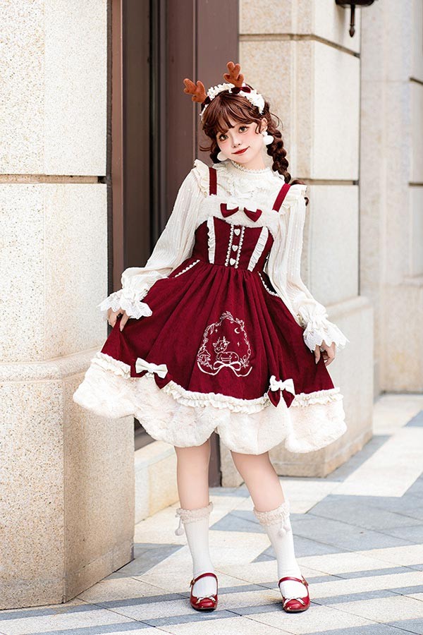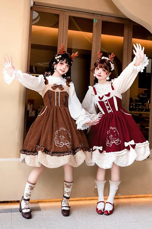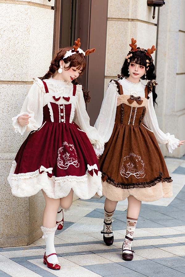 Lolita JSK ロリータ 鹿 刺繍 コーデュロイ 秋野鹿鳴 お姫様 プリンセス リボン本 シアー レースエッジ Aライン ハイウエスト 着?せ 撮影着 可愛い ワンピース S L lo009cycy