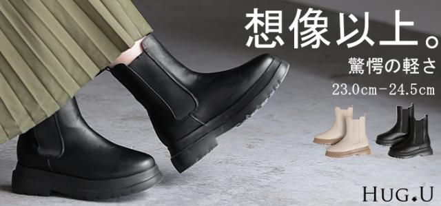 ブーツ フロントジップ レディース 合皮 フェイクレザー ショートブーツ ボリュームブーツ 大人カジュアル 5センチ ヒール ファスナー 靴 厚底 シューズ 歩きやすい ブラック ジッパー カジュアル ボリュームソール くつ クツ 春 夏 黒 HUG.U 秋新作