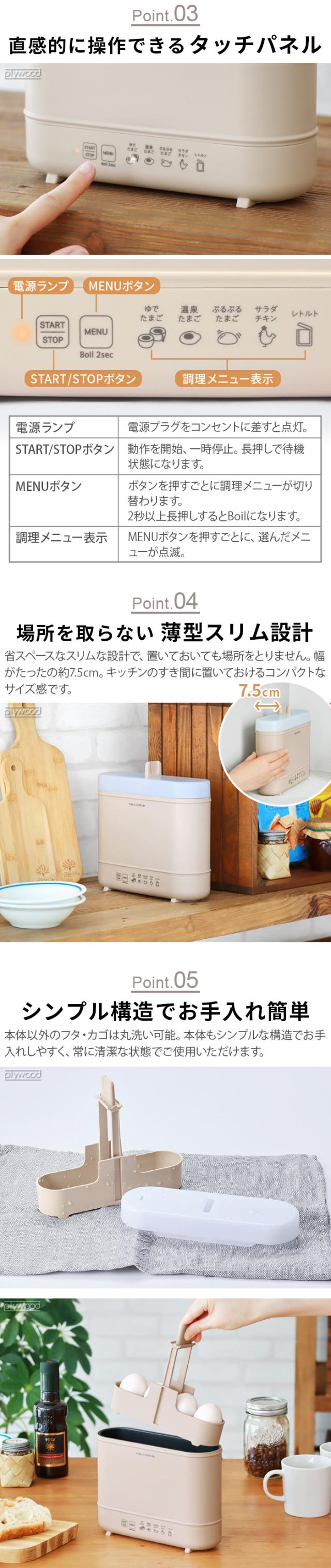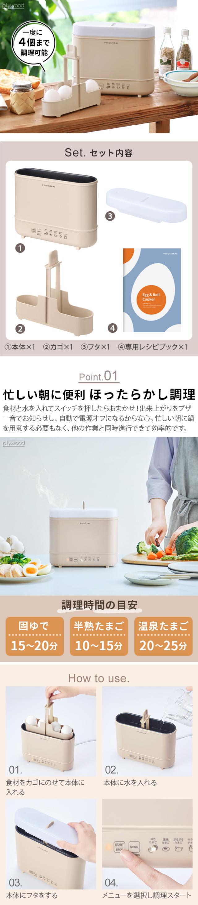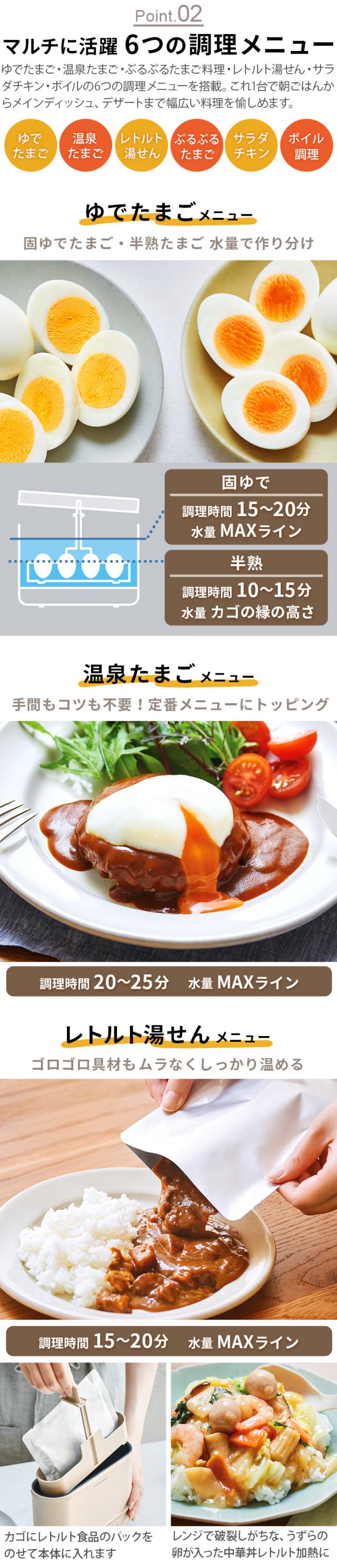 | 鶏卵1〜4個対応 6つの調理メニュー ゆでたまご・温泉たまご・ぷるぷるたまご・レトルト湯せん・サラダチキン・ボイル 専用レシピブック付き(8品目掲載) |