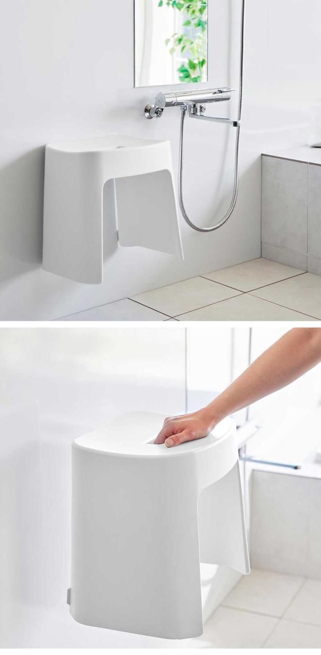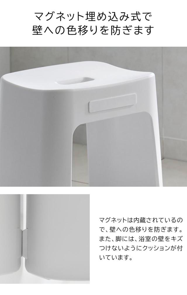 立つ・座るの動作がしやすい、高さ32cmの風呂イスです。使用後は、イスの背面に付いているマグネットで浴室壁面にペタッと貼り付け、浮かせて収納!大きくて置き場所に困る風呂イスを、邪魔にならない壁面に収納することで床は広々!お風呂掃除もラクにできます。風呂イス自体のお手入れも簡単!内側は凹凸の少ないスッキリとしたデザインなので、洗いやすく衛生的です。浮かせているので水切れも良く、乾燥が早まりスッキリ清潔に保てます。マグネットは埋め込み式なので壁面への色移りを防ぎます。また、収納する際、壁面をキズつけないように脚にクッションが付いています。壁面収納以外に、浴槽のフチに脚を引っ掛けて収納も可能です。