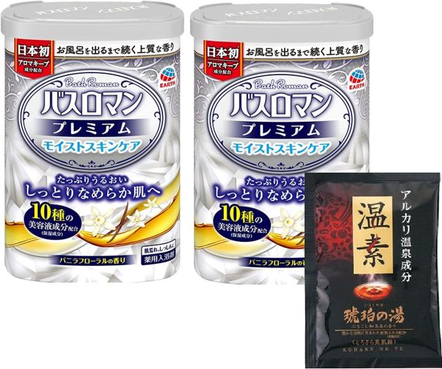 まとめ買い バスロマン プレミアム モイストスキンケア×2+おまけ 温素琥珀の湯1包 薬用 入浴剤 医薬部外品 血行促進 肩こり 腰痛 アース製薬