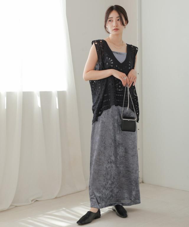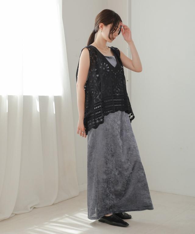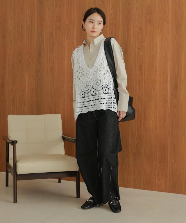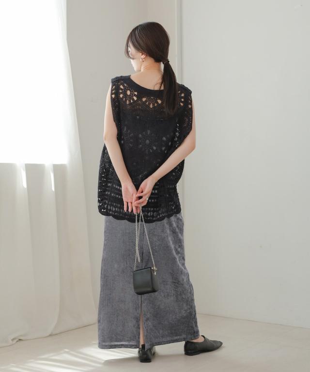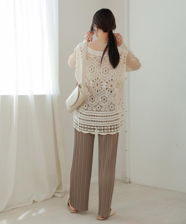 長いシーズン楽しんでいただけるさらっとお召し頂きやすい細番手の糸で編み上げたクロシェベスト!ゴワゴワ感が無いのでストレスフリーな肌触りです。繊細な編地の為、引っ掛かけには十分ご注意ください。
