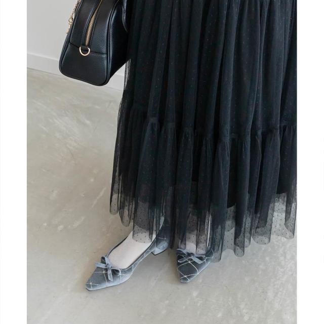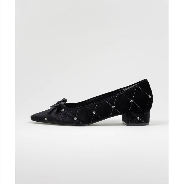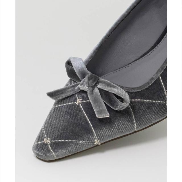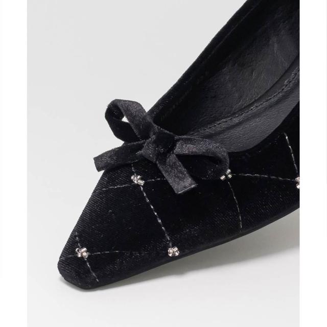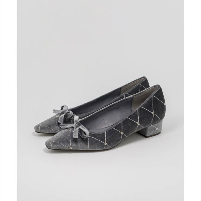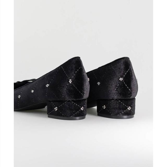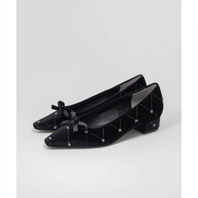 【22−25.5】ビーズ×キルティング リボン ローヒールパンプス