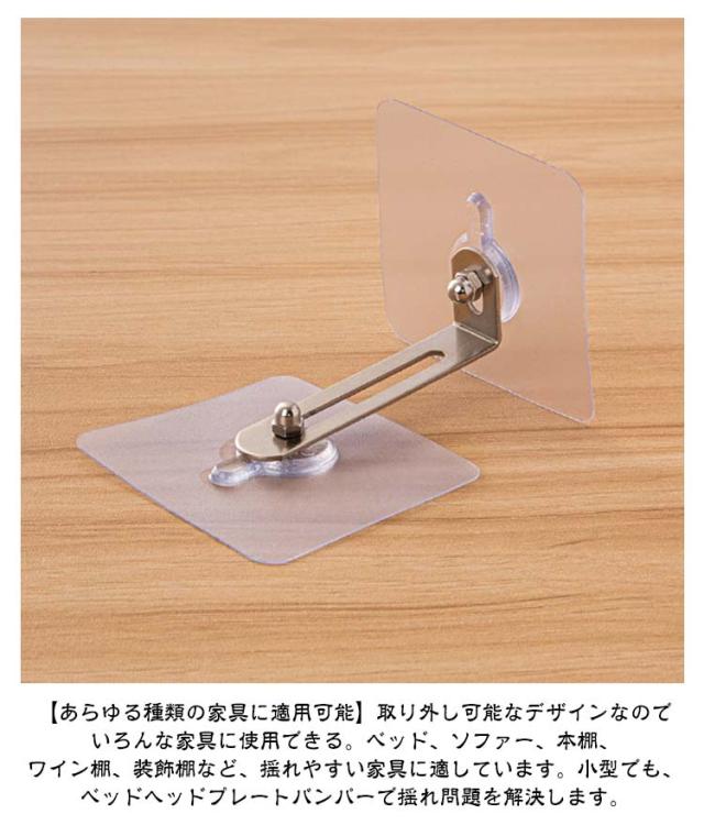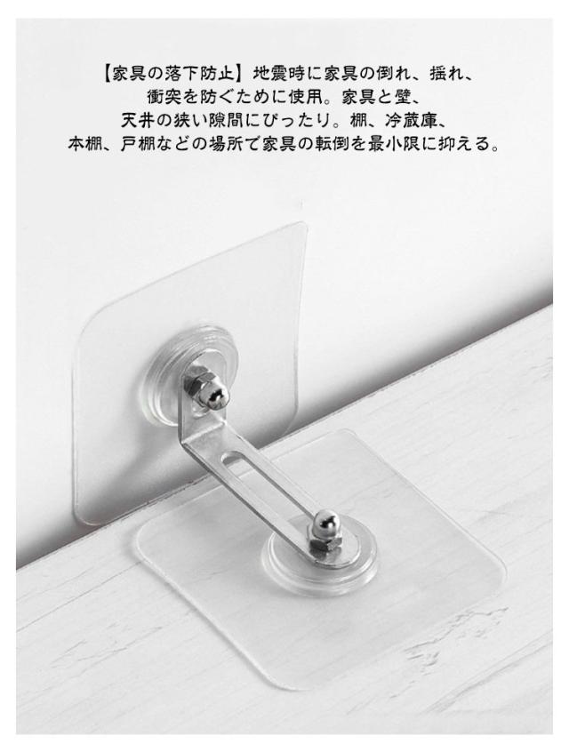 | 壁に穴をあけることなく、簡単に取り付けられる地震対策グッズです。 【耐震ストッパー】地震や衝突による家具の転倒や移動を防止 - 家具を固定して安全を守る。 【穴開け不要】簡単取り付け、工具不要の家具転倒防止! 【家具の落下防止】地震時に家具の倒れ、揺れ、衝突を防ぐために使用。家具と壁、天井の狭い隙間にぴったり。棚、冷蔵庫、本棚、戸棚などの場所で家具の転倒を最小限に抑える。 【あらゆる種類の家具に適用可能】取り外し可能なデザインなのでいろんな家具に使用できる。ベッド、ソファー、本棚、ワイン棚、装飾棚など、揺れやすい家具に適しています。小型でも、ベッドヘッドプレートバンパーで揺れ問題を解決します。 【子供の転倒アクシデントを防止】小さなお子様のいる家庭にいいです。お子様が家具に登ったりして家具が転倒するのを防止します。 | |