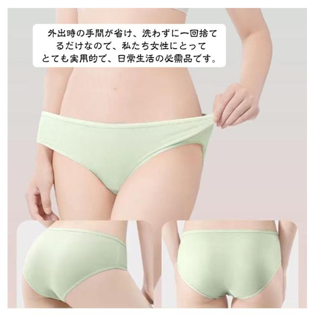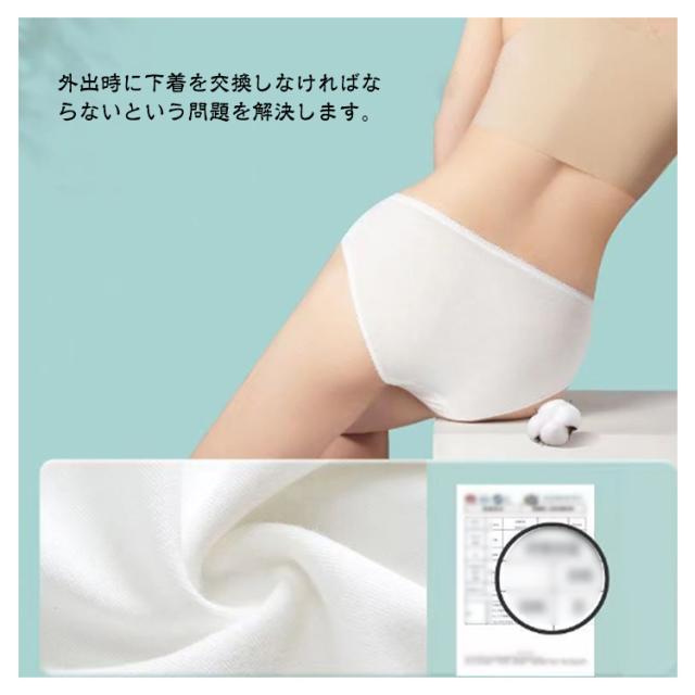 | レディース用使い捨てショーツ。 外出時に下着を交換しなければならないという問題を解決します。 外出時の手間が省け、洗わずに一回捨てるだけなので、私たち女性にとってとても実用的で、日常生活の必需品です。 柔らかい肌触り。綿素材で吸湿通気性を持ち合わせ、伸長性に優れた生地を使用して、あらゆる動作において動きやすく、さわやかな着心地です。 屋内または屋外でのスポーツ、旅行、入院、産後、キャンプ、ハイキング、ワークアウト、スパ訪問、または日常の使用に最適です。 | |