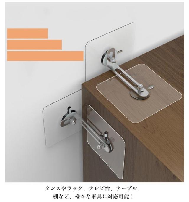 | 壁に穴をあけることなく、簡単に取り付けられる家具転倒防止グッズ。 【20個セット】 家具、家電、パソコンの天板や側面を固定することで、地震時の転倒・落下を防止します。 接着シールによる固定のため家具や壁を傷つけません。設置時に家具を持ち上げたり傾けたりする必要がなく簡単です。 タンスやラック、テレビ台、テーブル、棚など、様々な家具に対応可能! シンプルなデザインなのでどんなところに取り付けても目立たず、お部屋の雰囲気を壊しません。 | |