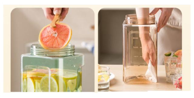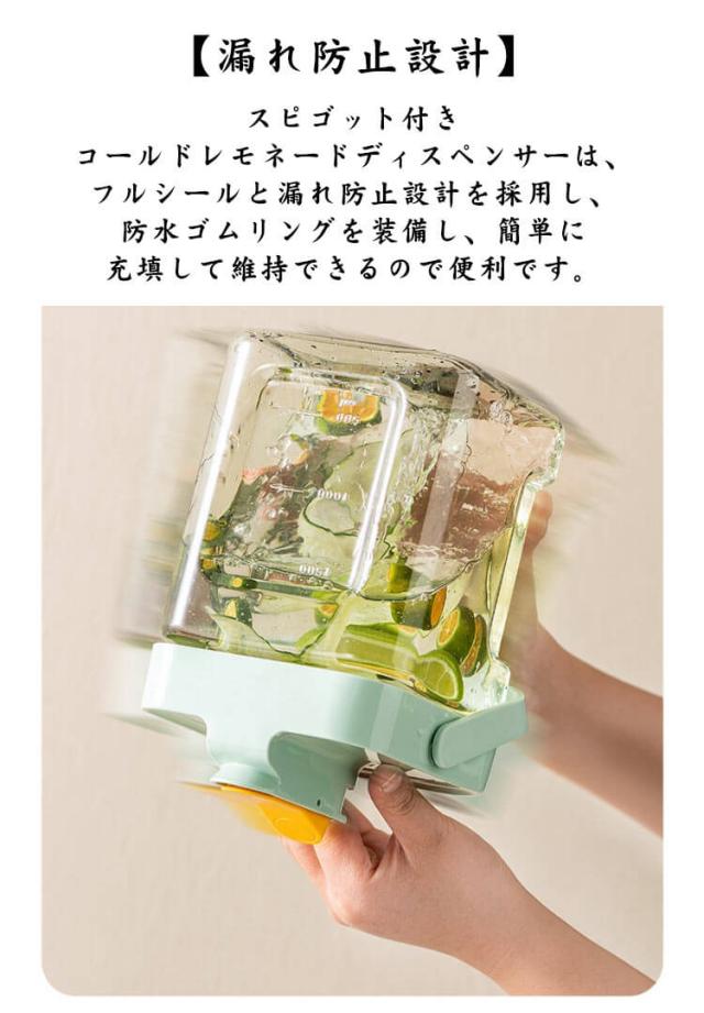 | 蛇口付き冷蔵庫ポット 【高品質材料&耐熱・耐冷】冷蔵庫ポットは食品に安全なAS素材でできており、安全で無毒、高温・低温に強く、-20℃〜100℃の温度差に耐えるケトルです。熱湯を入れたら、やけどを避けるため室温まで冷ましてください。 【大きな出水量】冷水筒は独特の蛇口デザインを採用しており、軽く押すだけで涼しい飲料水を得ることができます。広くて平らな水出口は水をすばやく排出し、冷たい飲み物をより早く楽しむことができます。 【漏れ防止設計】スピゴット付きコールドレモネードディスペンサーは、フルシールと漏れ防止設計を採用し、防水ゴムリングを装備し、簡単に充填して維持できるので便利です。 【3.5L大容量】飲料ディスペンサーは、約3.5リットルの大容量で設計されており、1日2人の取水量に対応でき、広い開口部の蓋が付いているため、簡単にお手入れできます。 【飲料水ディスペンサー】レモネードバケットは冷蔵庫に収まるコンパクトなサイズで、暑い夏にワイン、アイスティー、レモネード、フルーツジュース、ミルク、水を冷蔵でき、さわやかで涼しい味をもたらします。 | |
