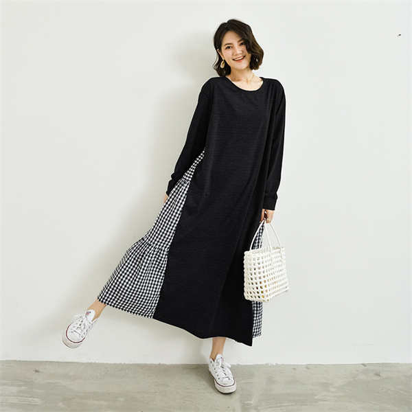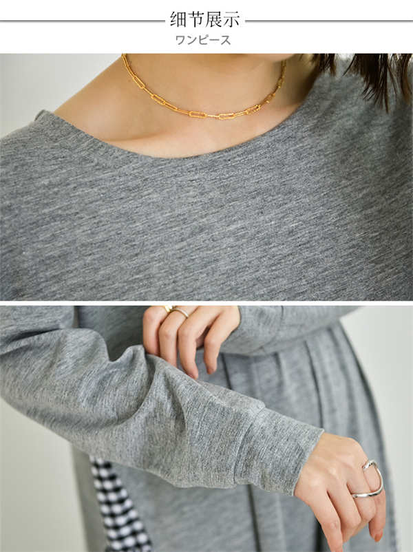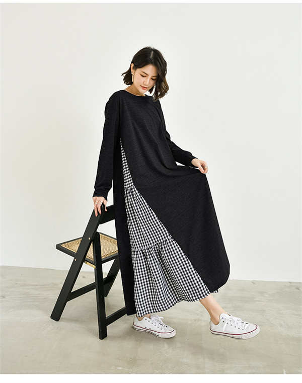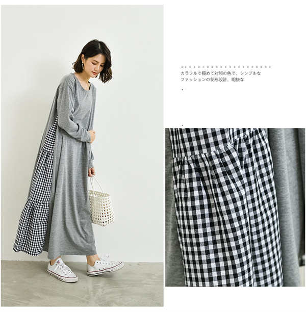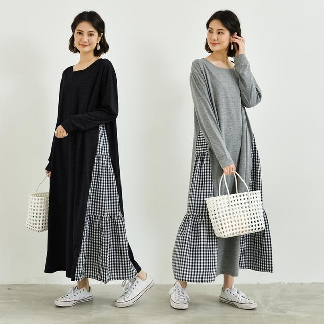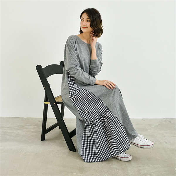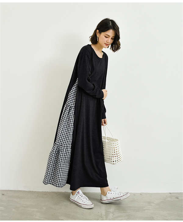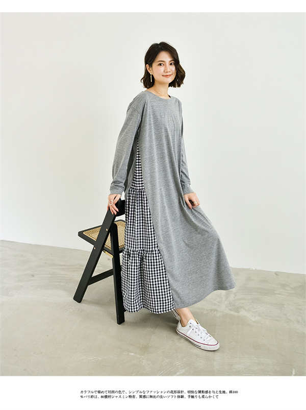 ワンピース ロング 長袖 ロンT 大人カジュアル ヌケ感 抜け感 無地 ギンガムチェック 異素材 ティアード感 女性らしい シンプル