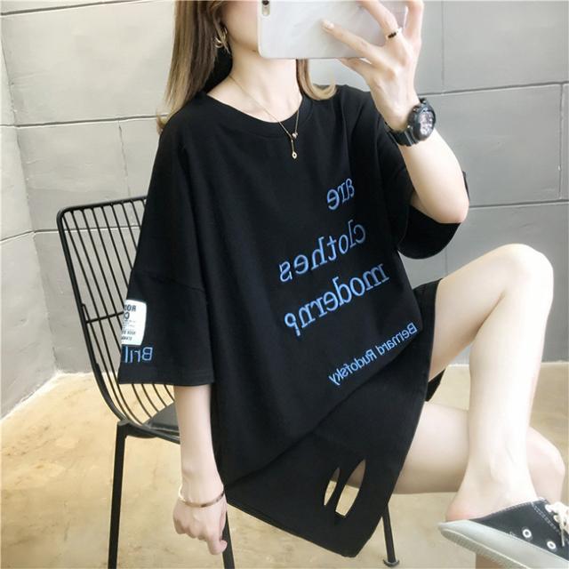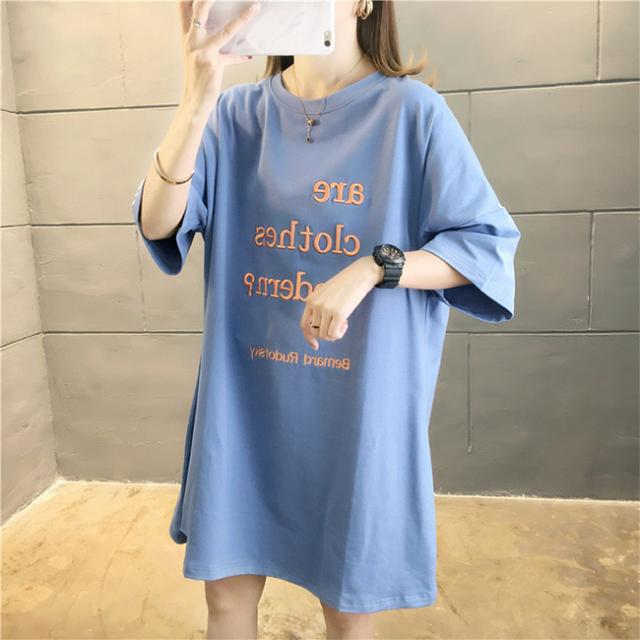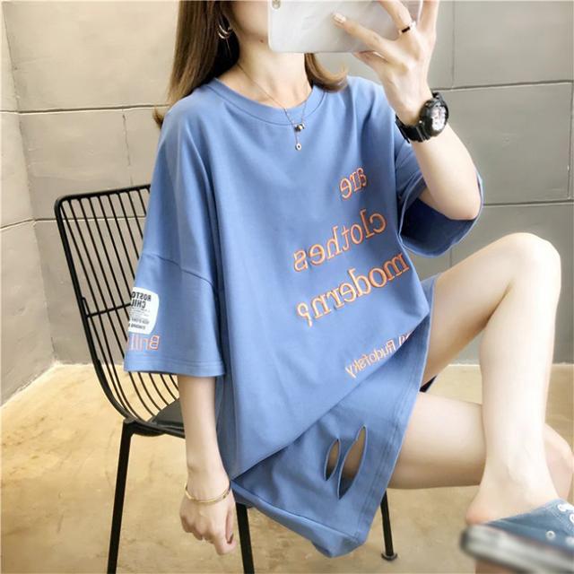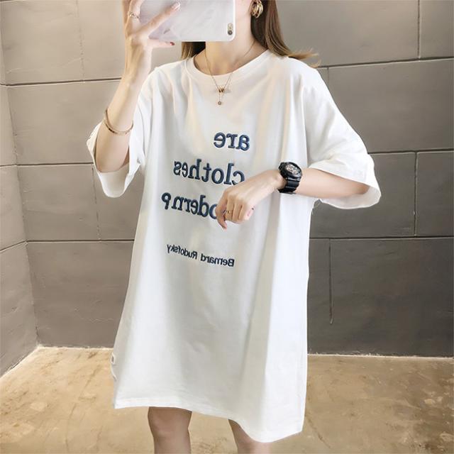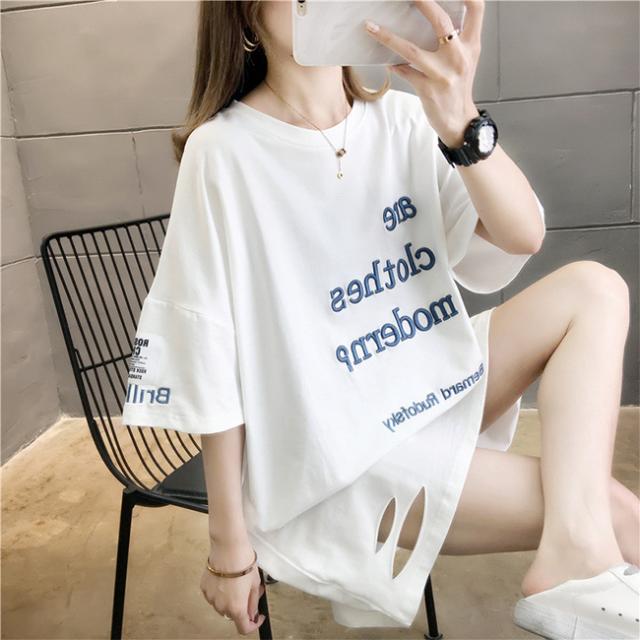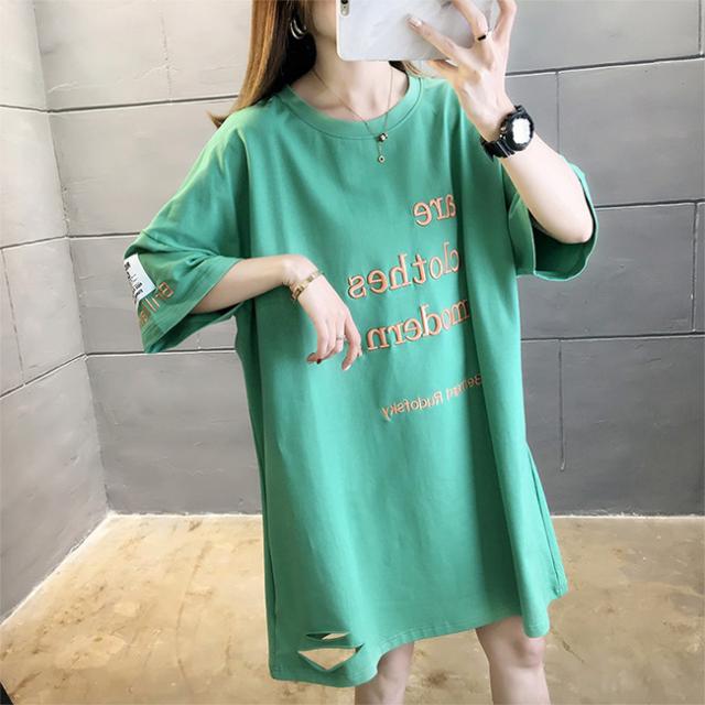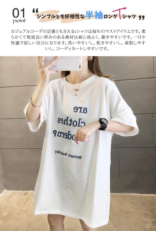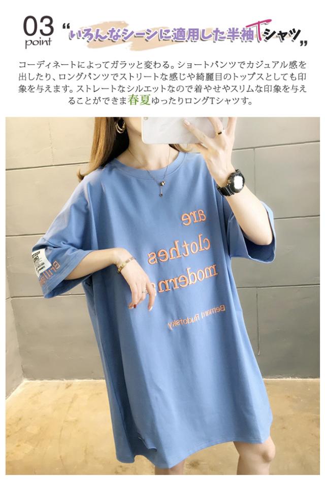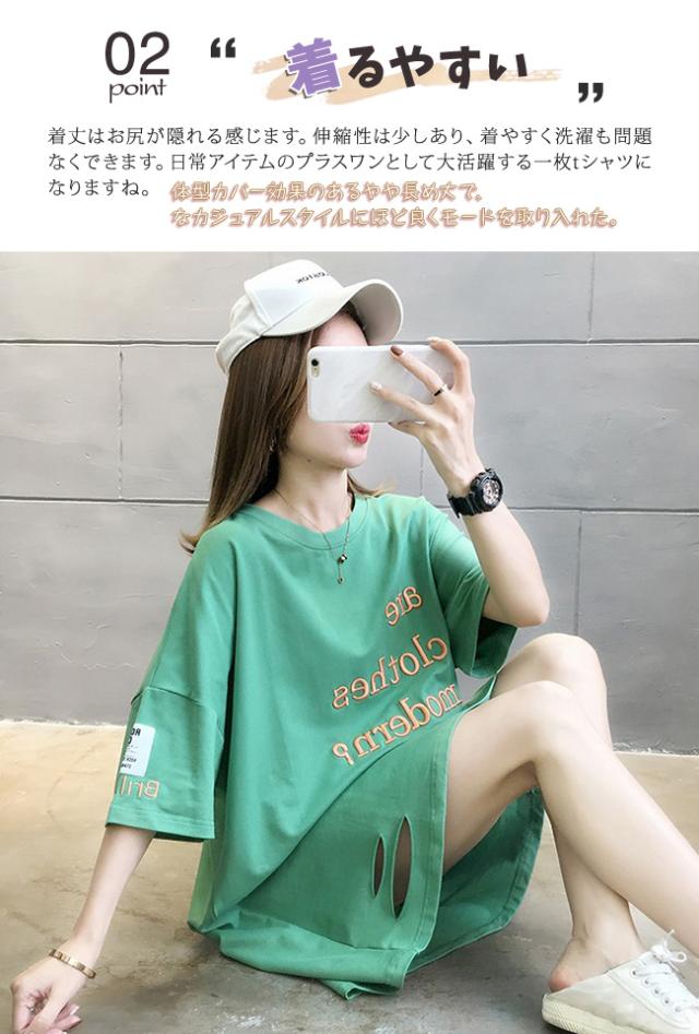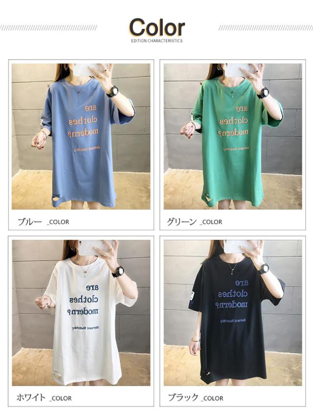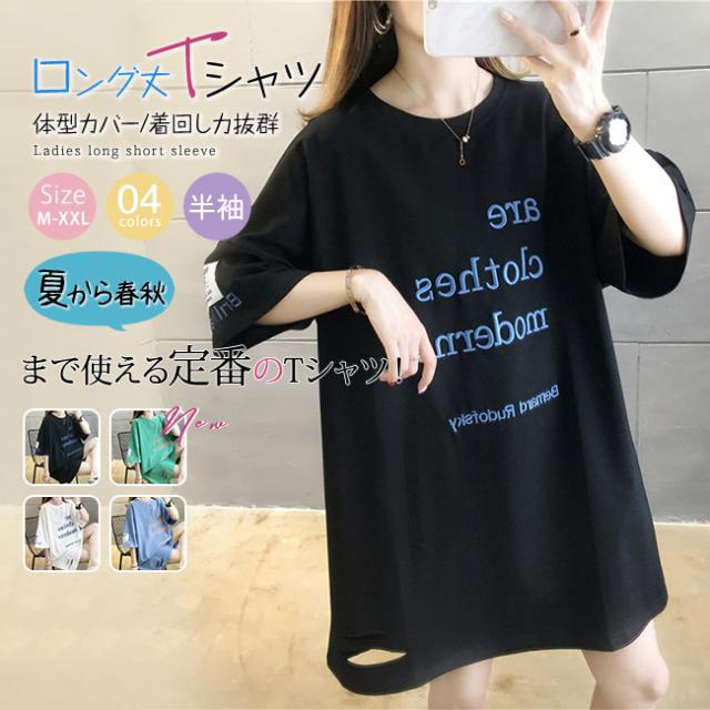 tシャツ レディース 半袖 ロング丈 ゆったり ビッグシルエット ロゴTシャツ ダメージ加工 丸首 ロンT ロングTシャツ カットソー カジュアル おしゃれ 大きいサイズ ファッション夏服