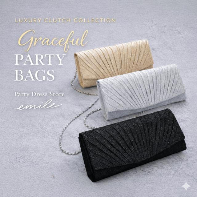 このクラッチバッグは、煌めくラメ素材が使用され、シンプルながらも上品なカシュクールデザインが特徴です。結婚式やパーティーシーン、お食事会、謝恩会といったフォーマルな場面で、服装を美しく引き立ててくれます。バッグの正面には華やかなプリーツが施されており、スタイルに洗練された輝きをプラスします。