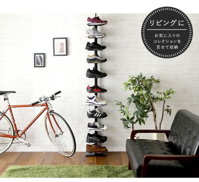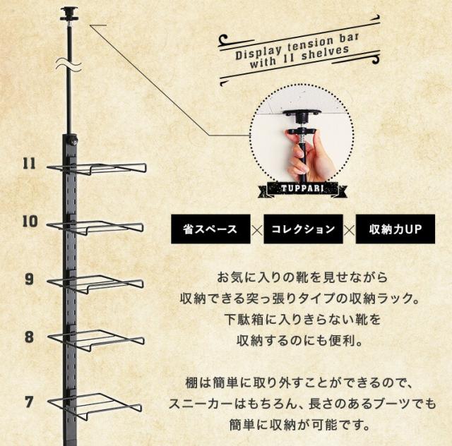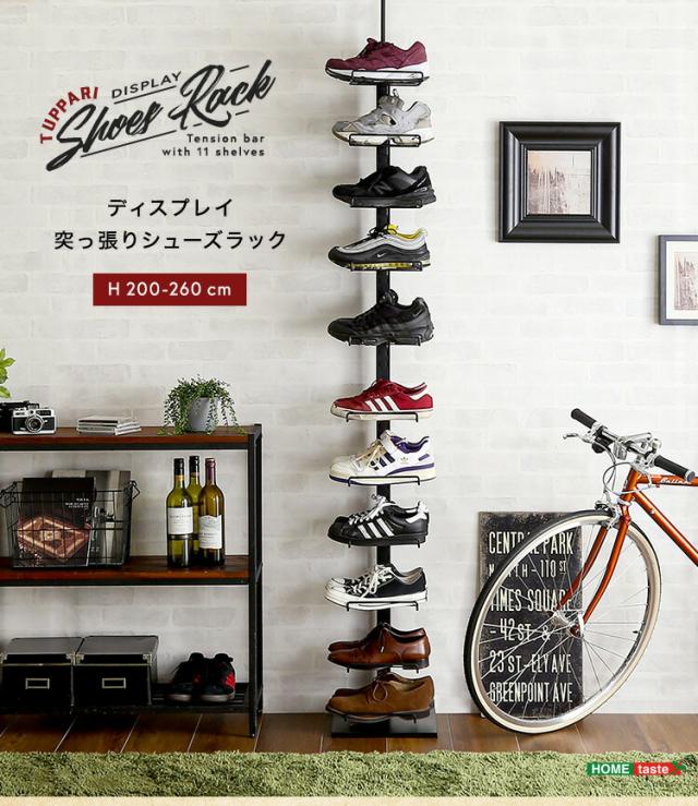 シューズラック 突っ張り ディスプレイラック 11段 スリム 伸縮 高さ調節 省スペース 靴箱 下駄箱 靴入れ つっぱり 突っ張りシューズラック 玄関 靴収納 【代引不可】
