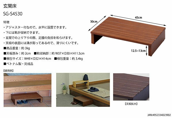 玄関踏み台 幅45cm 奥行30cm 木製 アジャスター付き 玄関台 玄関ステップ台 小型 玄関床 ステップ 足台 靴収納 玄関収納 フクダクラフトSG-S4530KDB 【代引/同梱不可】